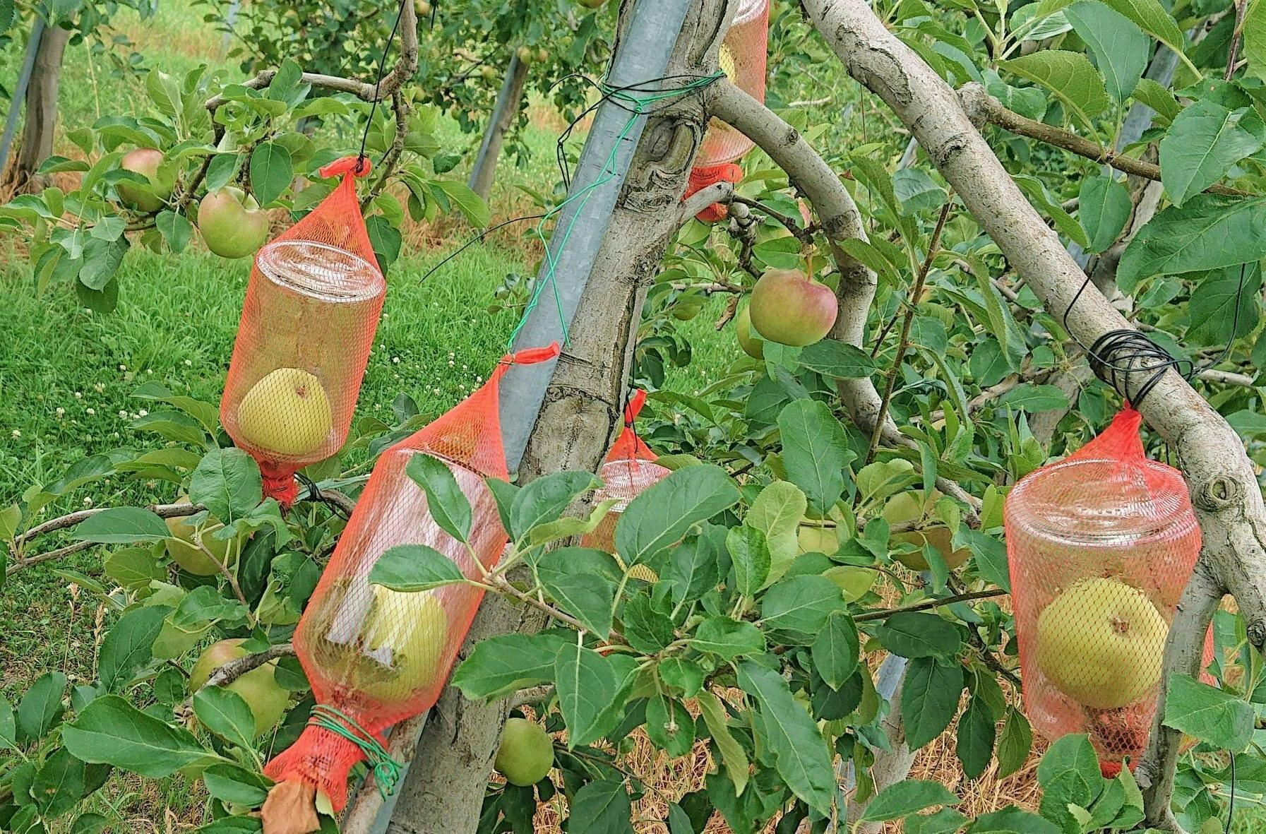 瓶の中で守られながら、風や雨にも負けずにりんごが成長します