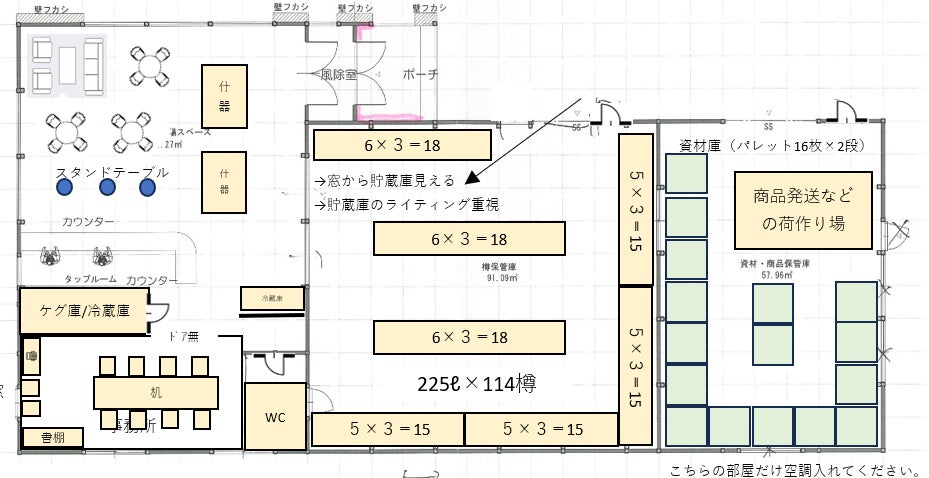 第二工場平面図イメージ(左から販売所兼タップルーム、樽貯蔵庫、資材庫)