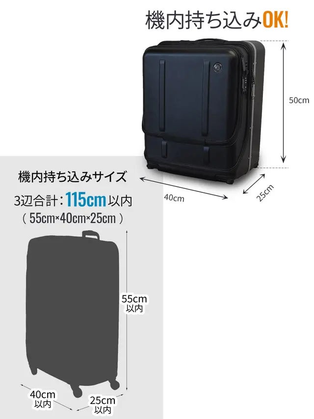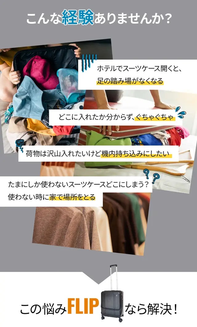 ・キャスター外した状態で機内持ち込みの極限サイズ(50cm×40cm×25cm,47L) だから、たくさん入ります! ※機内持ち込み制限は、3辺の合計が115cm以内で、55cm×40cm×25cm以内(航空会社や飛行機種別によって規定は異なりますので必ずご自身でご確認ください) ※制限はキャスター込みなので、キャスターが外せないスーツケースはキャスター の分、内容量が小さくなってしまいます。フリップは制限いっぱいまで活用可能