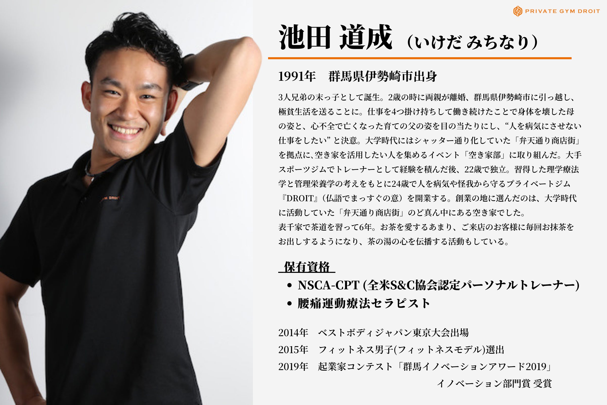 群馬県前橋市で、幅広い分野のへルスケア専門家が在籍するプライベートジム『DROIT (ドロイト)』を運営しています。
