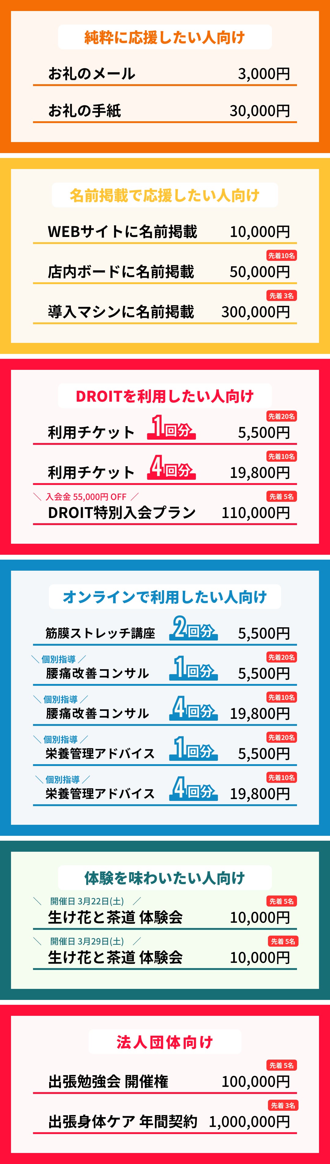 2025/01/13 11:03たくさんの方のご支援により126名から1,937,000円が集まりました。本日1月13日(月)23:59までの残り13時間で1,063,000円のご支援を集め、私はこの挑戦を必ずや成功させます。まずはご支援いただいた皆さま、仲間となっていただき、これまで支えてくださり本当にありがとうございました。そして、これから支援を考えていて未来のジム構想のプロジェクトオーナーになる方へDROIT Labo一押しのリターンのご紹介をさせていただきます。① 【WEBサイトに名前掲載 10,000円】1番人気で48名様にご支援いただきました。群馬のパーソナルジム業界では最もPV数のある当店HPにお名前を掲載させていただくリターンです。②【オンライン栄養管理 19,800円】1名さまにご支援いただいております。DROIT Laboに所属する管理栄養士によるオンライン個別栄養管理が受けられるリターンです。現状の身体症状や体型に関するお悩みについてヒアリングを行い、症状改善や目標達成のための食事提案を実施。全4回に渡ってフィードバックを行い、理想の食事内容に近づけます。もちろん、現状の生活実態に見合った無理のないご提案をいたしますので、このコンビニだったら何食べればいいの?と言ったような要望にもプロがしっかりとお答えできます。③【店内ボードに名前掲載 50,000円】9名様の方にご支援いただきました。内2名が高校時代の同級生で驚きました。①に加えて店内のボードにも名前掲載させていただくリターンです。こちらは残り1つです。④【出張勉強会開催権 100,000円】1名の方にご支援いただきました。DROIT Labo の専門家集団を呼んで勉強会やイベントを開催することができるリターンです。健康づくりに関する「運動・食事・睡眠」を軸に、ダイエットや腰痛予防、健康診断結果の読み方や病気予防などをテーマに話す講師として出張します。⑤【DROIT Labo特別入会プラン 110,000円】DROIT Laboにお得にご入会いただけるリターンです。(通常165,000円)病気を防ぐジム『DROIT Labo』の全てのサービスを受けるにはメンバーとなる必要があります。会員さまが受けられるサービスは下記の通りです。・全身怪我リスクチェック・遺伝子検査で病気リスク/ダイエット体質チェック・病気予防のための動画コンテンツ全視聴権・オーダーメイドインソール作成(何度でも修正OK)・管理栄養士による献立作成/カロリー栄養計算・パーソナル栄養弁当サービス(料金別途)・フィットネスWatch(レンタル)を使った健康管理サービス・医師/管理栄養士によるアドバイス・会員さま同士の交流イベント参加権このクラファン限定でご利用チケットも安く購入出来ます。通常週1回で1年間通うには計73万5千円必要ですが、本日1/13(月)23:59まで限定で計37万4千円(50%OFF)でご案内可能です(11万円の入会プラン+26万4千円の上乗せ応援)⑥【導入マシンに名前掲載 300,000円】1名の方にご支援いただきました。今回の復興の象徴となる関節エコー機の設置代にお名前を刻印するリターンです。群馬を代表する著名人たちが通うDROIT Labo。全お客様が必ず目にしますのでその宣伝効果は計り知れません。⑦【出張ケアサービス年間契約 1,000,000円】月々8.3万円で従業員さまのお身体の悩みにDROIT Laboの専門家を総動員してお応えします。毎月1回各30分x10人×12ヶ月のパーソナルコンディショニングを御社事務所にて実施します。インボディ体組成計も持参しますので会社全体で1年間のダイエットチャレンジを行うことも可能です。社長の飲み代より遥かにお安く効果絶大です。以上です。改めて、これまでご支援いただいた方、そして片付けボランティアにご参加いただいた方、記事シェアなどにご協力いただいた方、皆さまのお力でここまで来れました。本当に有難う御座います。残り12時間、最後の最後までどうか宜しくお願い申し上げます。 もっと見る