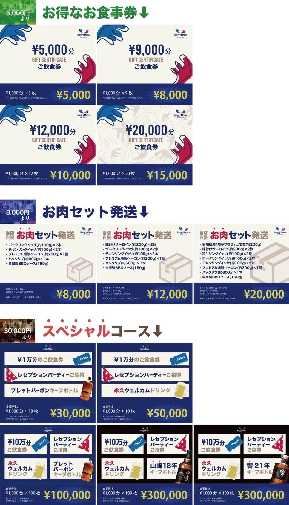 リターンはお得な食事券や、お店が存続する限り使える永久ウェルカムドリンク、レセプションパーティーご招待などをご用意しました。また、遠方の方などご来店が難しい方向けにお肉セットの発送もございます。