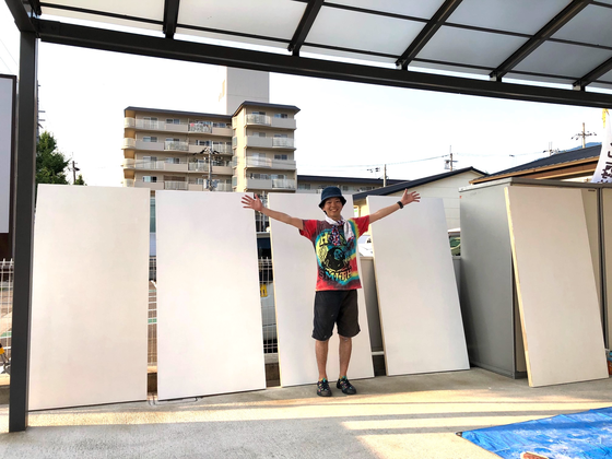 外気温38度…何もしなくても汗だくになるような陽気の中、大きな木枠を組み立てたり、カナヅチを振るったり、パネルの表面にジェッソを塗ったり…。