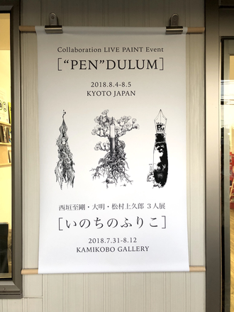 ライブペイントに先立ち、西垣至剛・大明・松村上久郎3名によるグループ展示会「いのちのふりこ」が、バックス画材2階のGALLERYにて開催されます。