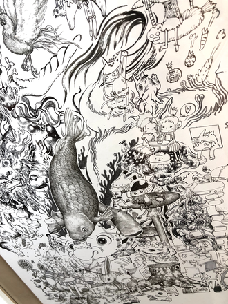 いつもプロジェクトを応援していただき、誠にありがとうございます。 皆さま、大変お待たせをいたしました。 いよいよ明日、ライブペイント本番です。 バックス画材の2階GALLERYに登場するのは、高さ1.8メートル×横4.5メートルの特大パネル。 1本のペンに魂を込め、そこにありったけの命を描き込みます。 新進気鋭のアーティストによる完全なるアドリブかつハイレベルな戯れを目撃したい方は、ぜひ明日と明後日の2日間、京都・白川北大路のバックス画材にお越しください。 ※ライブペイントの会場は、屋外GARDENから店内GALLERYへ変更になっています。 写真は、モリモリに準備した物販のキャプション作りに余念がない松村上久郎さん(のリアルアバターさん)です。