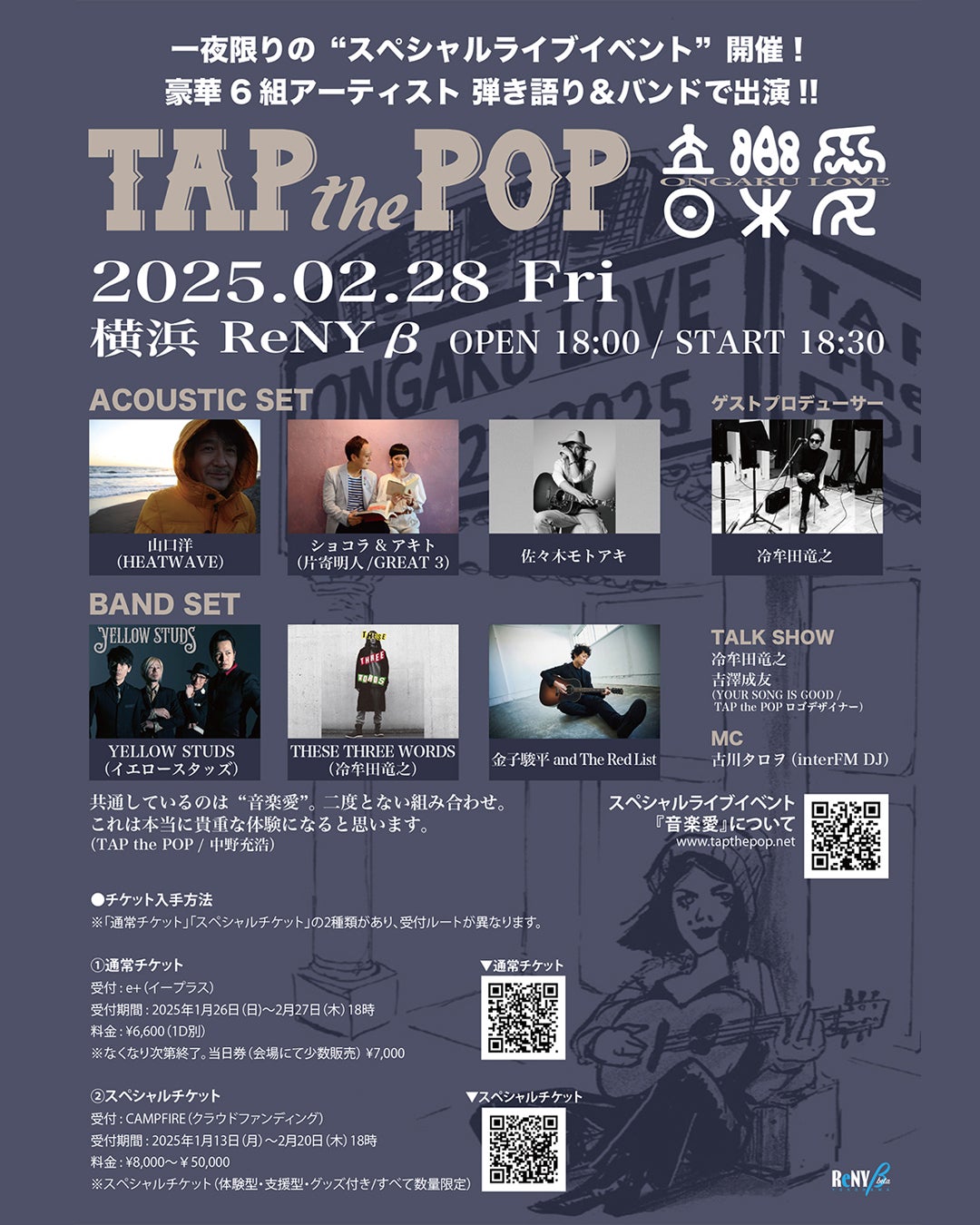 TAP the POP 12年目にして、最も実現したかったことの一つです。今回は記念すべき第1回スペシャル版として、“音楽愛”に共感してくれた3組の弾き語りと3組のバンドに出演してもらえることになりました。