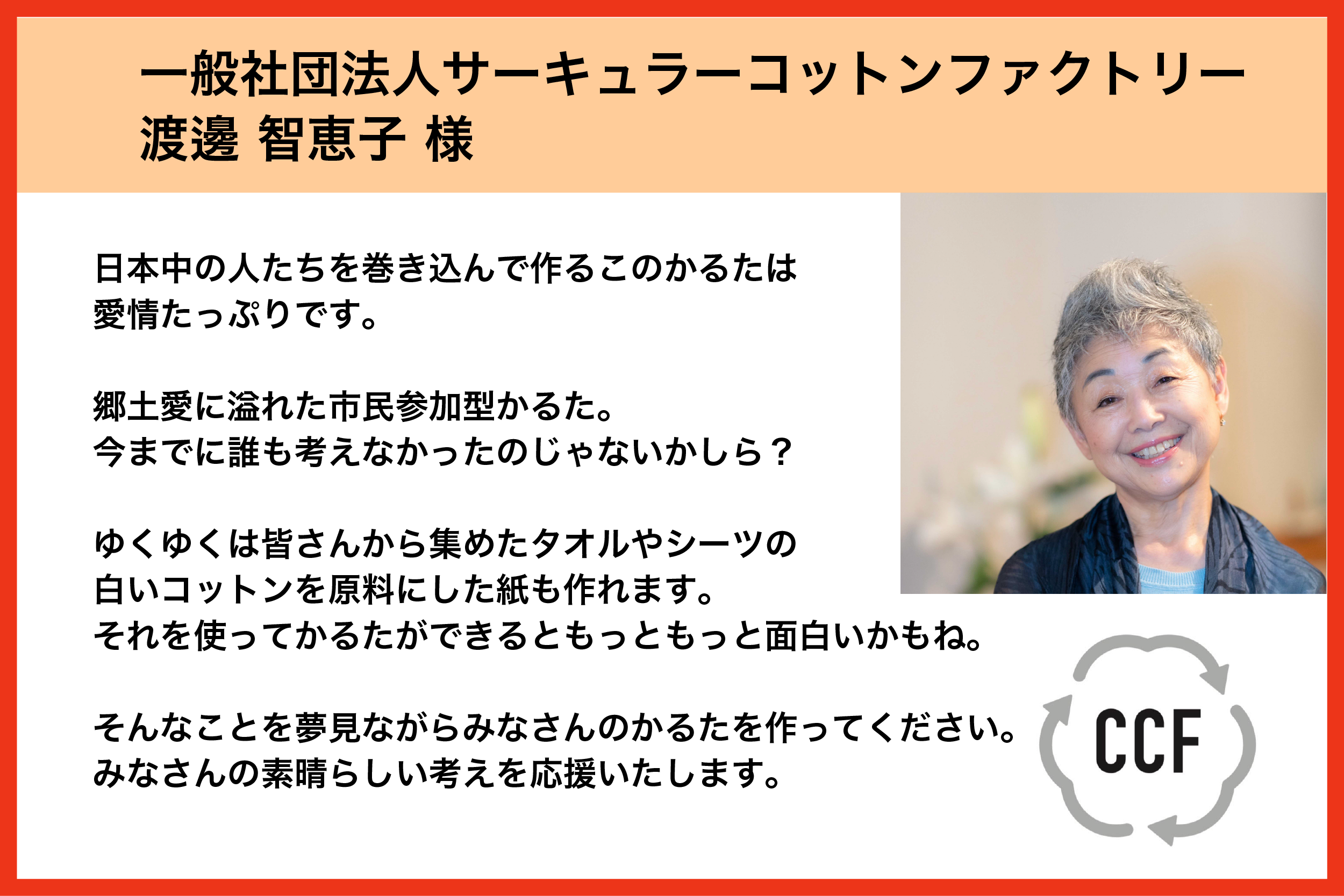 このサーキュラーコットンペーパーを取り扱っている一般社団法人サーキュラーコットンファクトリーの代表理事の渡邊智恵子様より応援メッセージをいただきました!ありがとうございます!