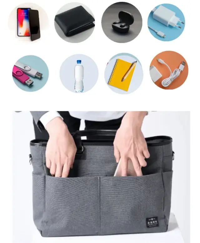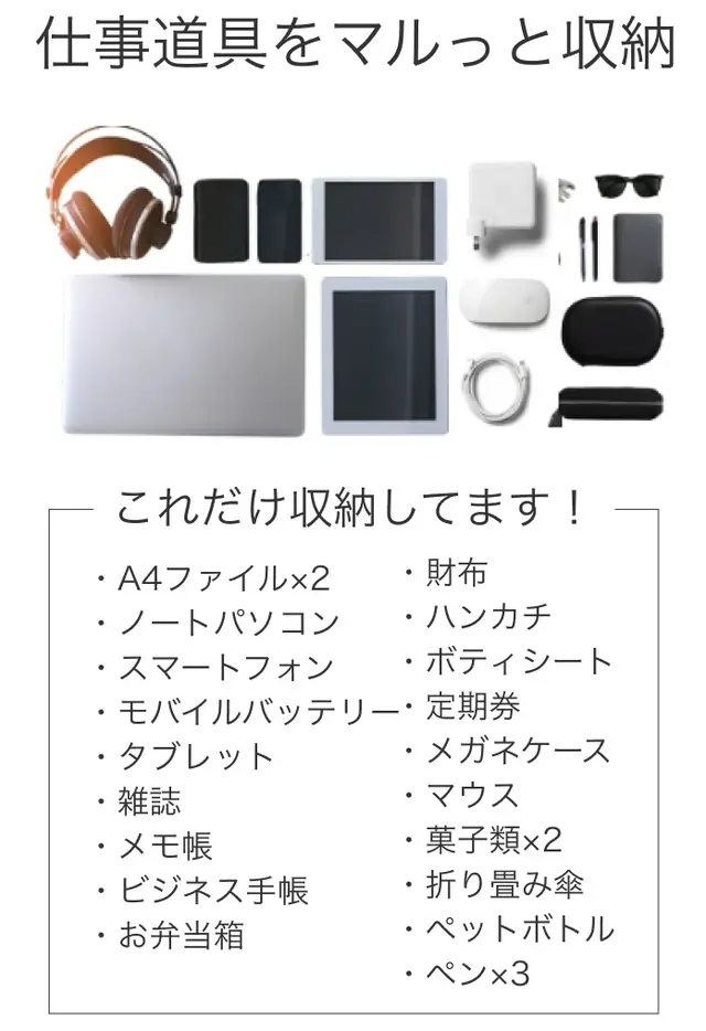 これひとつで、1日中外出しても安心。動くオフィス、とも呼べる収納力です。