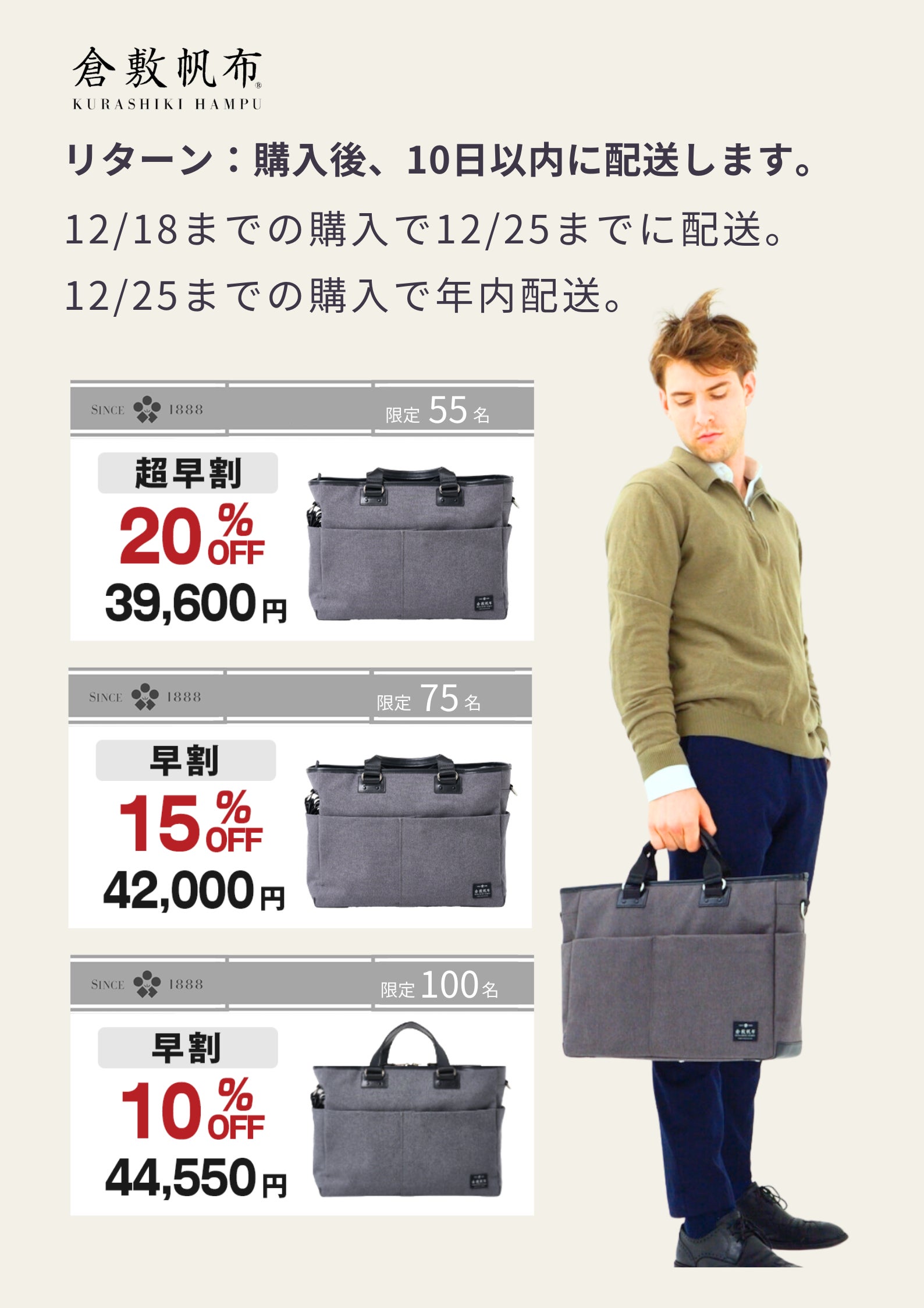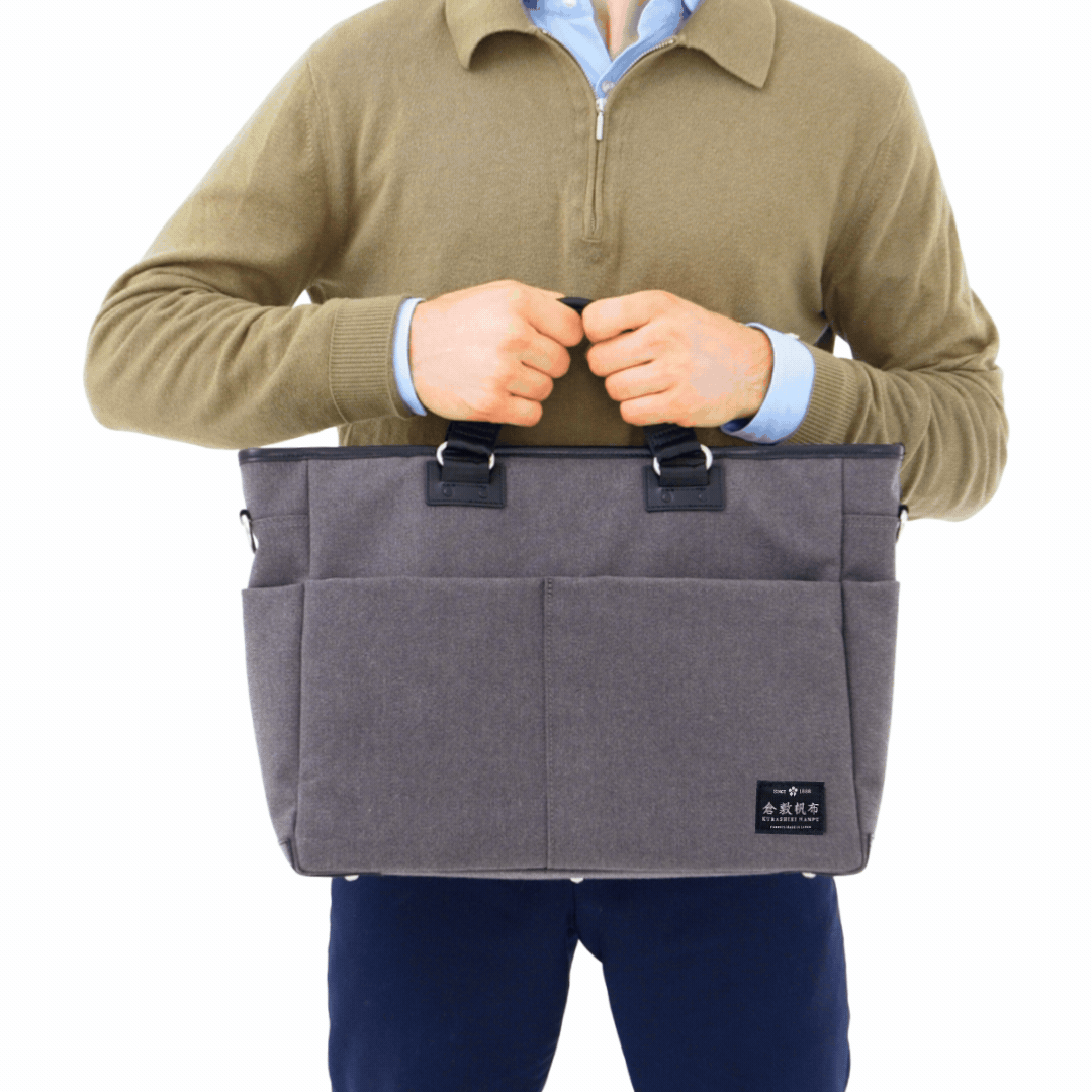 近年、ビジネスシーンでも天然素材が注目されています。その背景には、環境への配慮や、心身のリラックス効果など、様々な理由があります。私たち倉敷帆布は、長年の経験とモバイルワーク時代のビジネスパーソンの徹底的なニーズ調査から、「どんなシーンでも使いやすい」がキーワードだと確信しました。その答えとして、使いやすさを追求した大容量の収納スペースと機能的なポケット配置、軽量で丈夫な天然素材、そしてビジネスシーンからプライベートまで幅広く使えるシンプルなデザインを融合させたバッグを開発しました。このバッグは、プロフェッショナルな印象を与えながら、忙しい日々をスマートにサポートします。そして、天然素材ならではの風合いが、あなたのビジネススタイルにワンランク上の洗練をもたらします。
