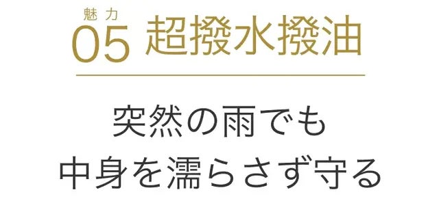 特殊な撥水撥油加工により、 水や油をはじく高い防汚性を備えています。雨の日や油汚れにも強く、あなたの大切な書類やデバイスを守ります。