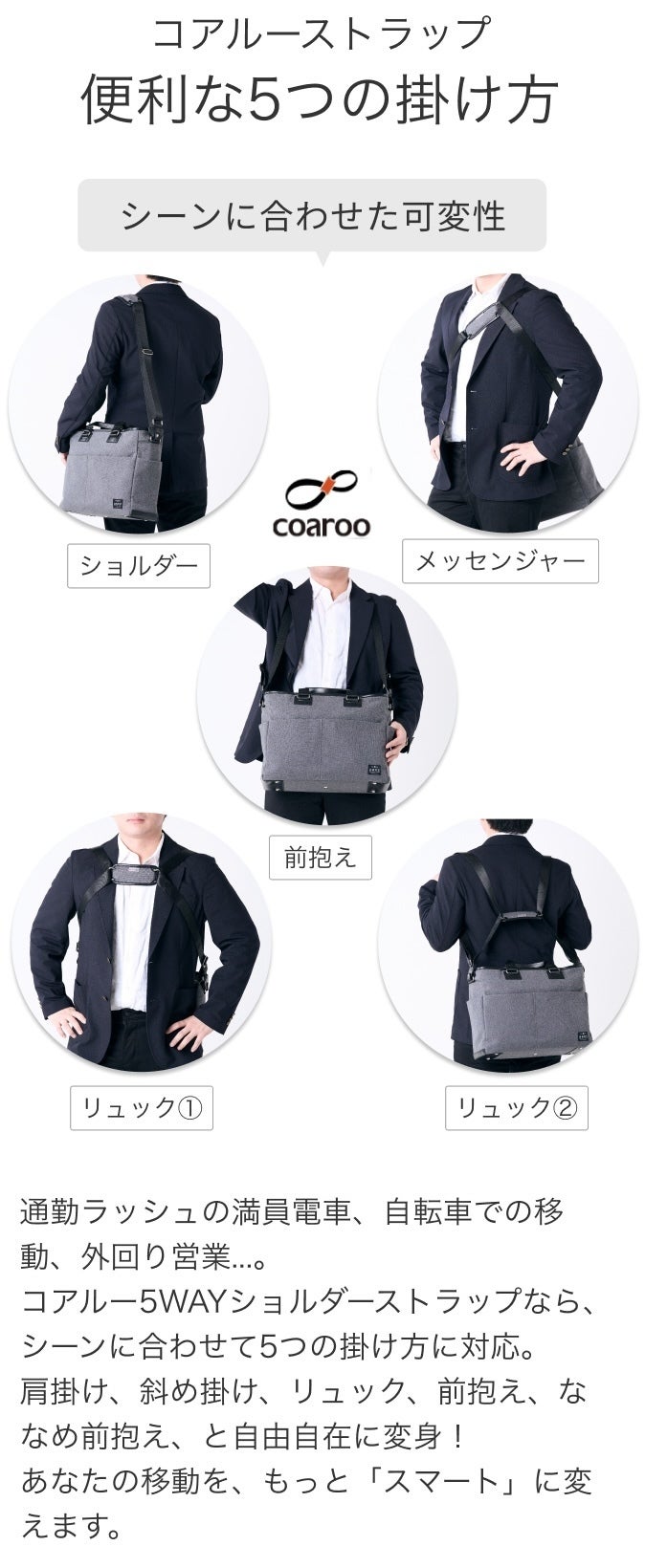 使う人のライフスタイルやシーンに合わせて持ち方を変えられる「5WAY快適設計ストラップ」は、移動中も仕事中もカラダへの負担を最小限に抑えます。