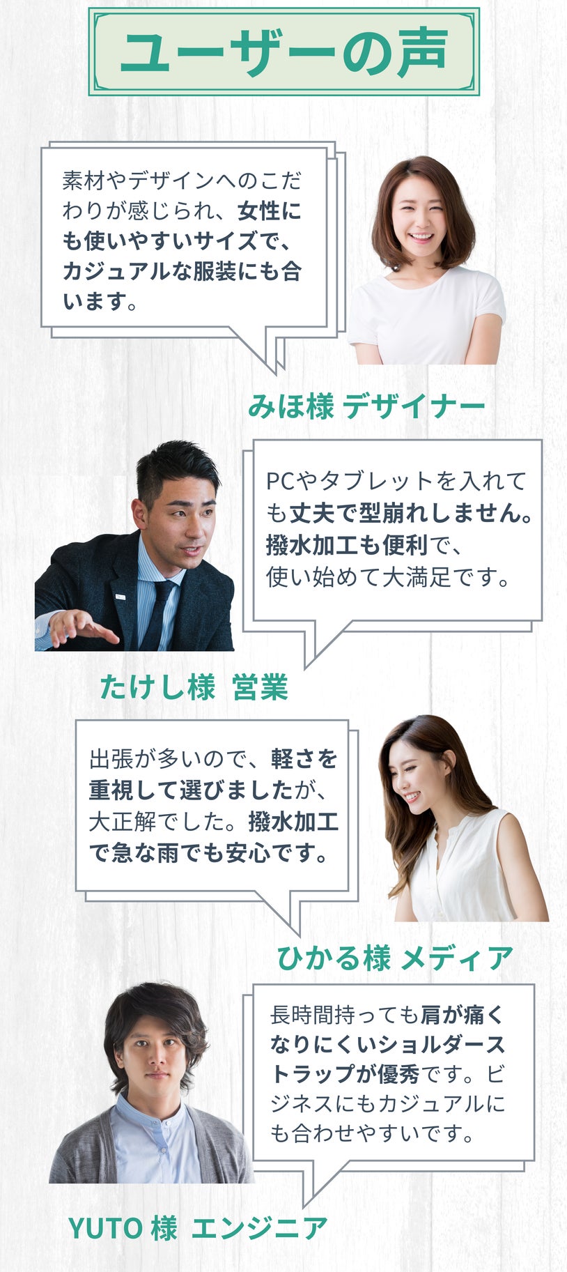 ライフスタイルに寄り添い、どんなシーンでも快適に使えるバッグを、共に開発しました。