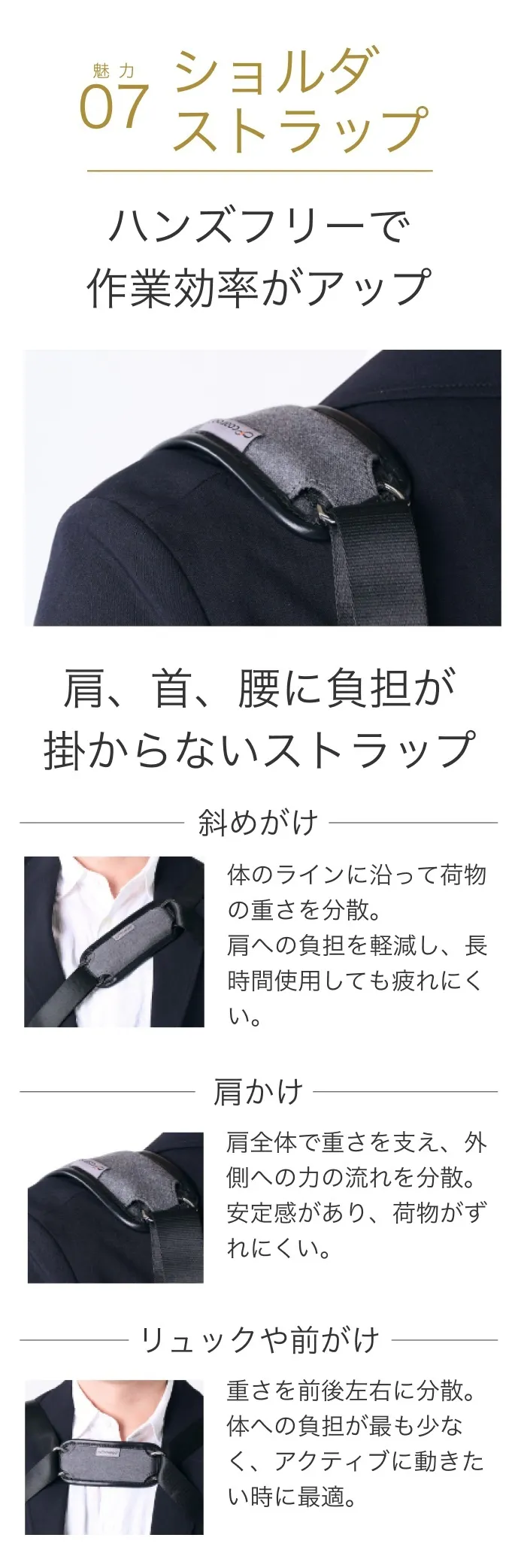 使う人のライフスタイルやシーンに合わせて持ち方を変えられる「5WAY快適設計ストラップ」は、移動中も仕事中もカラダへの負担を最小限に抑えます。