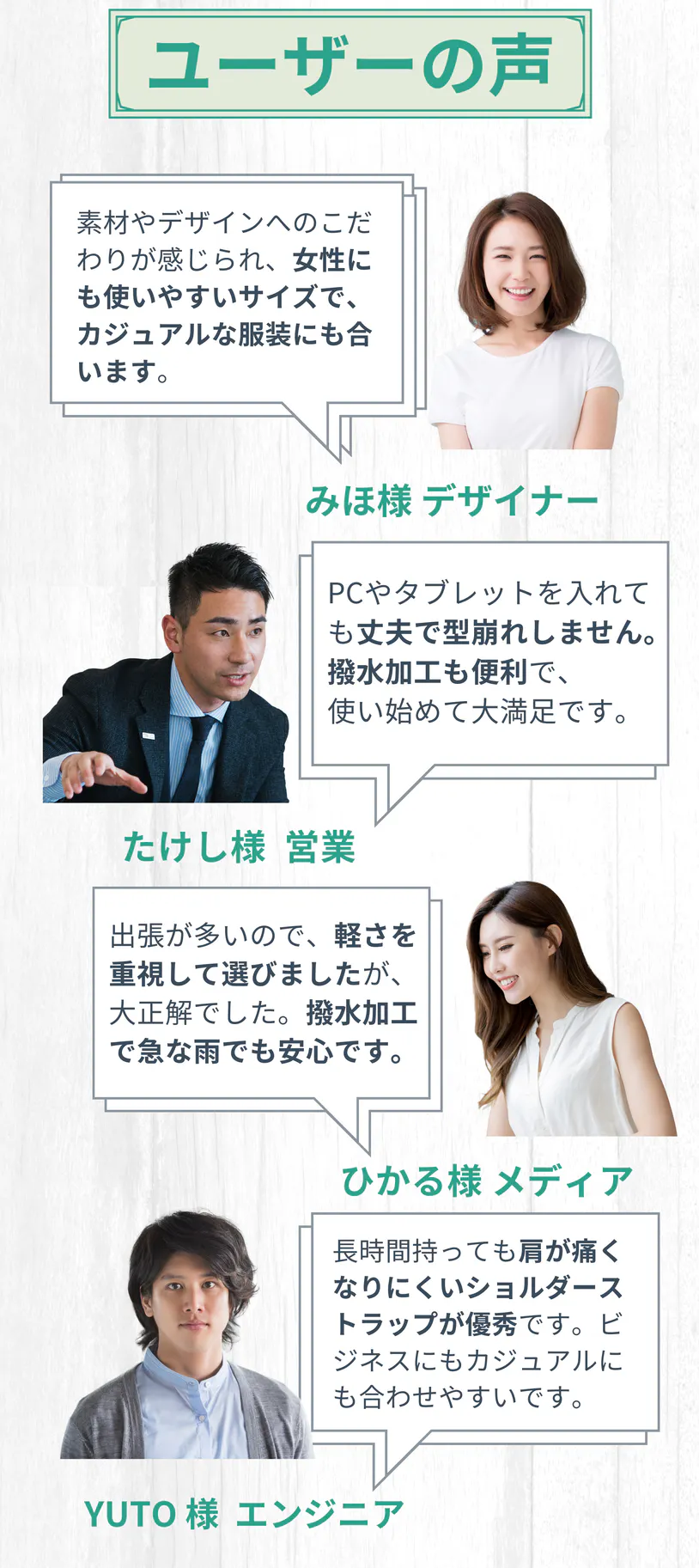 ライフスタイルに寄り添い、どんなシーンでも快適に使えるバッグを、共に開発しました。