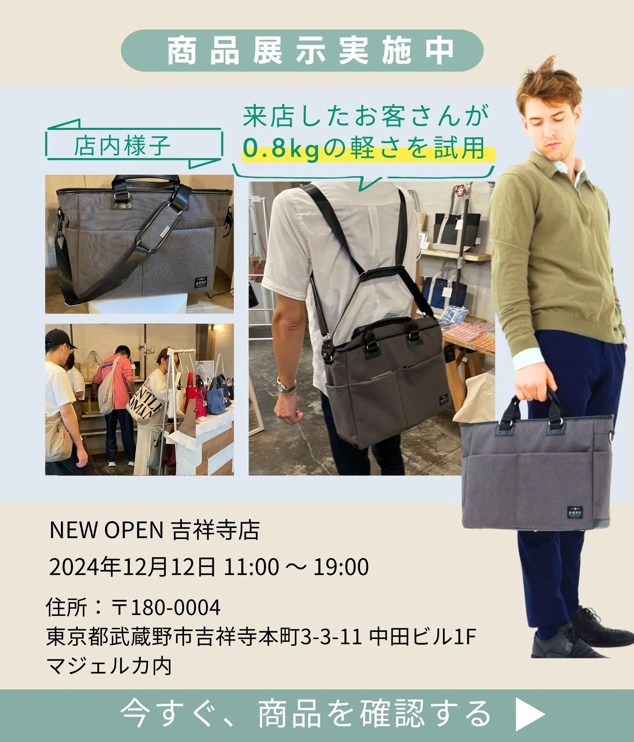 従来のビジネスバッグは、オフィスや特定の場所で使うことを想定して、多機能を重視して作られてきました。一方、倉敷帆布のモバイルバッグは、「カラダへの負担を、もっと軽くする」ように設計された超軽量の天然素材。