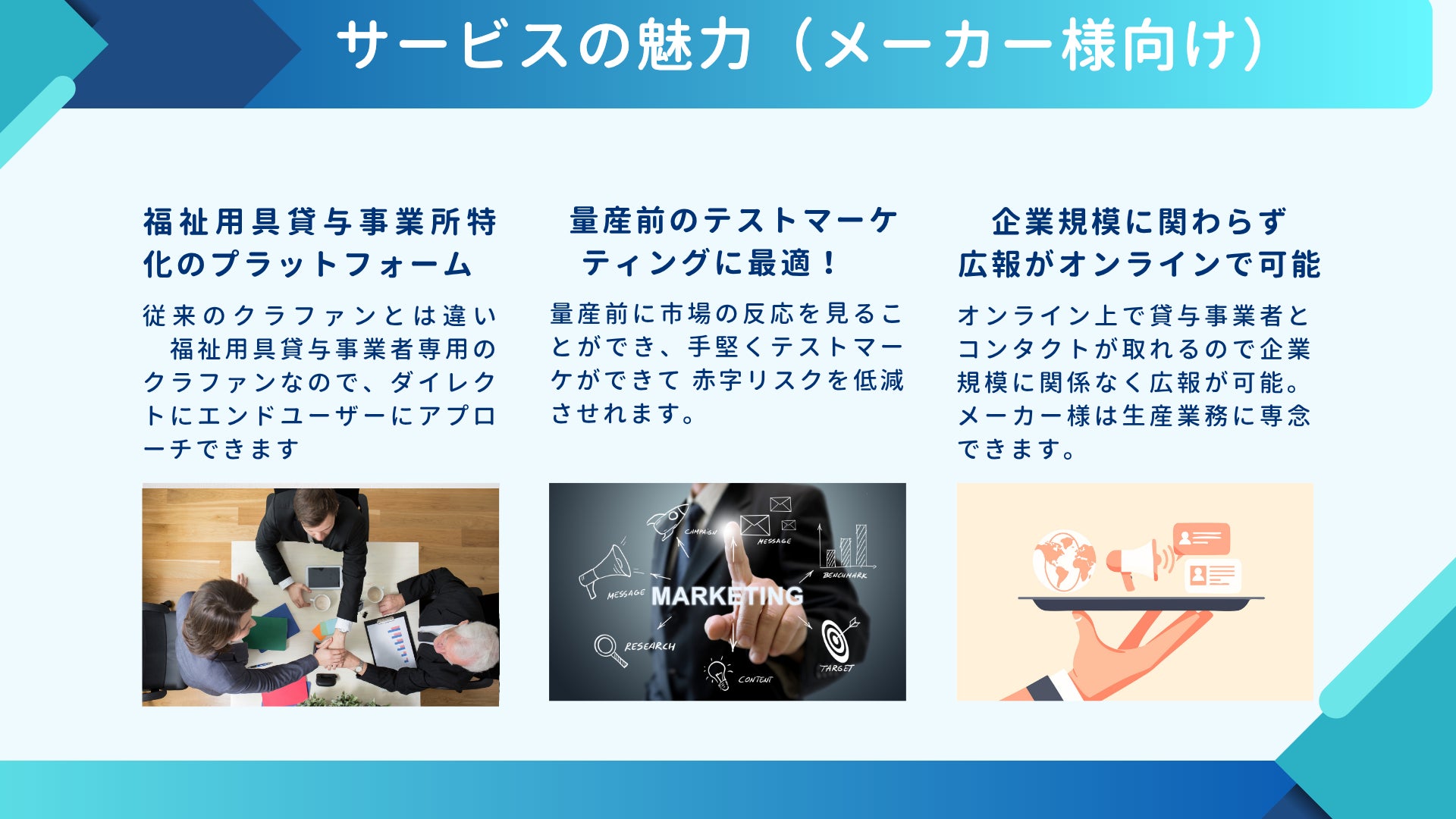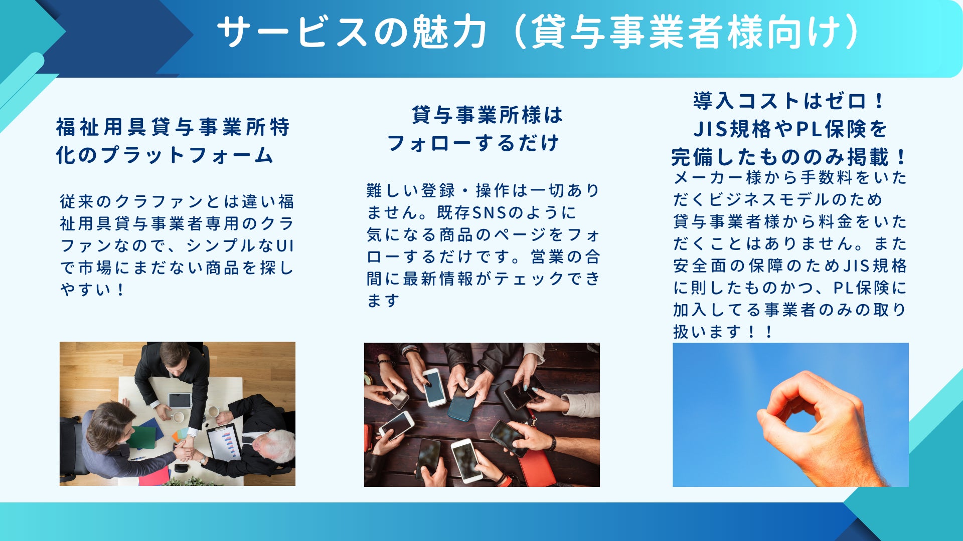 メーカーが新商品・改良品の情報を記載貸与事業所(福祉用具専門相談員)がいいねボタンとともに現場の声を投稿双方がオンライン上でマッチングして必要な現場に必要な用具を提案できるようになります。
