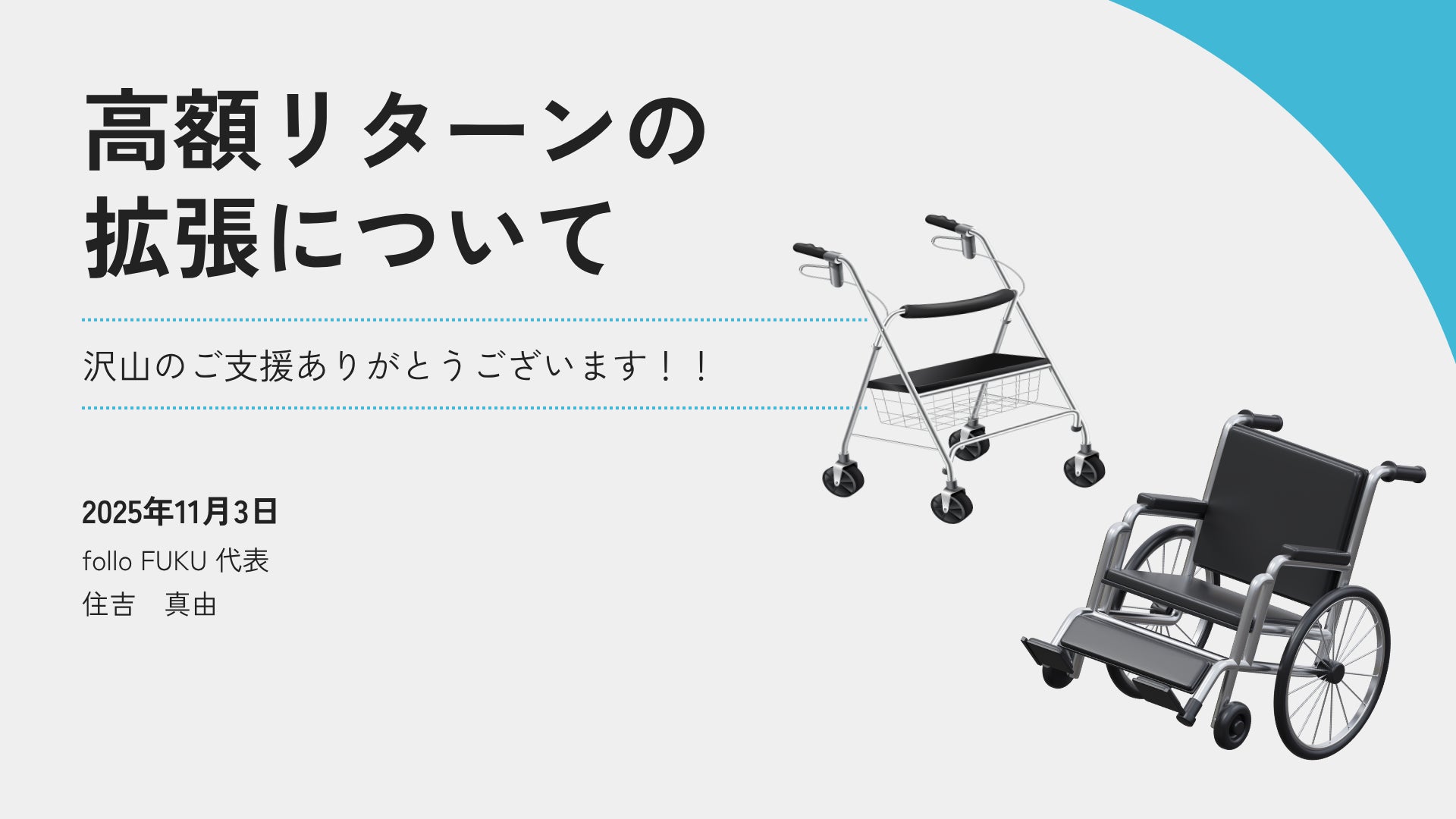 2025/11/03 18:12ご支援いただいている皆様、いつも本当にありがとうございます。folloFUKU代表の住吉です。これまで3万円・5万円のリターンについては、主にメーカー様向けとして設計しておりましたが、現在では貸与事業所・相談員・福祉用具貸与関連事業者の皆様からも多くのご支援をいただいております。 そのため本日より、これらの事業者様にも同条件でご参加いただける形に拡張いたします。対象となるリターン:3万円リターン(掲載料無料+限定共有会)現在はメーカー様を想定したリターンでしたが貸与事業所・福祉用具専門相談員・貸与関連事業者の方も対象となります具体的には・1月のオンライン共有会(β版の発表会)への参加権 β版のオンライン共有会にご招待します。住吉がβ版を発表・説明させていただくだけでなくこちらにご支援いただいたメーカー様と貸与事業者・福祉用具専門相談員さまそれぞれの視点で情報共有やご意見を交換していただけます。また、共有会ではテスト段階のfollo FUKUをいち早く体験できるため、皆様が現場で感じている課題やアイデアを反映することも可能になります。・β版ホームページ上の協賛者欄に無料掲載(希望者のみ)希望者の方のみになりますがβ版follo FUKUサイト内での協賛者紹介ページへの掲載を行います。5万円リターン(オフライン意見交換会+掲載)β版開発後の現地(広島)での意見交換会・戦略共有会にご招待します。(交通費は各自負担)用具の現場と開発者が垣根を超えて交流し、福祉用具界全体の新しい連携を模索する場です。β版の意見交換会よりさらに一歩進んだ本番リリースに向けた共有会となっております。また従来のリターン同様の特別枠掲載や、連携施策の優先案内などもご用意いたします。※これまでにご支援いただいた方も、追加手続きは不要です。※掲載・共有会のご案内はβ版リリース時(2025年1月予定)に改めてご連絡いたします。今回の拡張は、「福祉用具メーカーだけでなく、現場で日々支援を行う事業所や相談員の声も反映したい」という思いから決定いたしました。現場とものづくりの“橋渡し”をするために、これからも皆様と一緒に歩んでまいります。おかげさまで残り5日となりました。引き続きどうぞよろしくお願いいたします! folloFUKU代表 住吉 真由 もっと見る