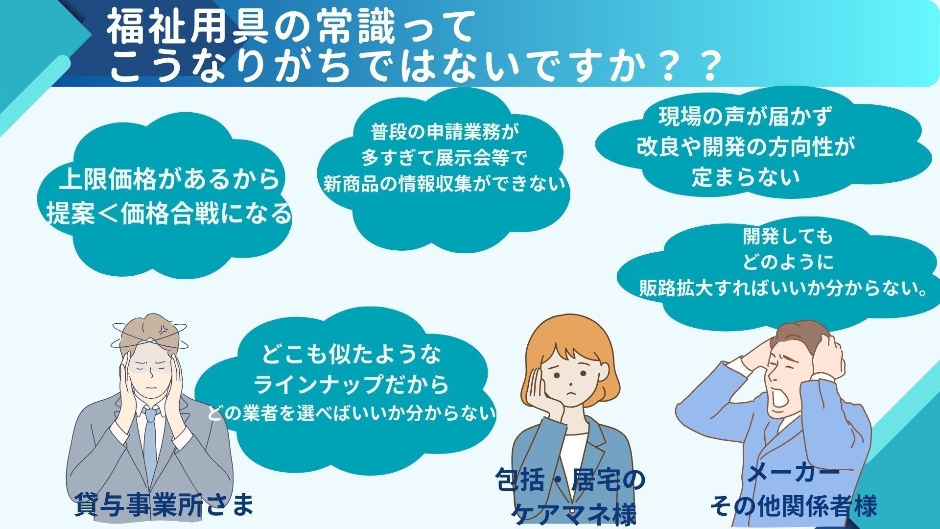 貸与事業所・専門職・メーカー、それぞれが努力しているのに、仕組みがバラバラなせいで力が合わさっていない。「ここをつなげられたら、業界はきっと変わる」——そう確信し、私は新しい挑戦を決意しました。