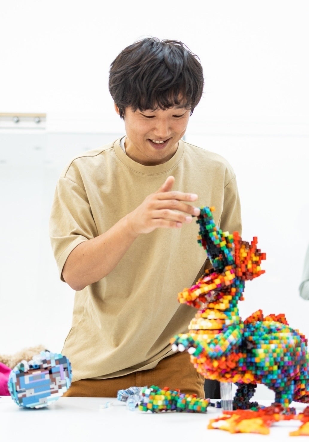 私の作品は、LEGO®︎ブロックが持つ限定的な色数を駆使したピクセル調のカラフルな配色構成が特徴で、これは子供の頃に遊んでいた低解像度のテレビゲームのドット絵からのインスピレーションです。また四角いパーツを組み合わせることで滑らかな造形を実現させることは、その曲線美を強調させる重要な要素となっています。