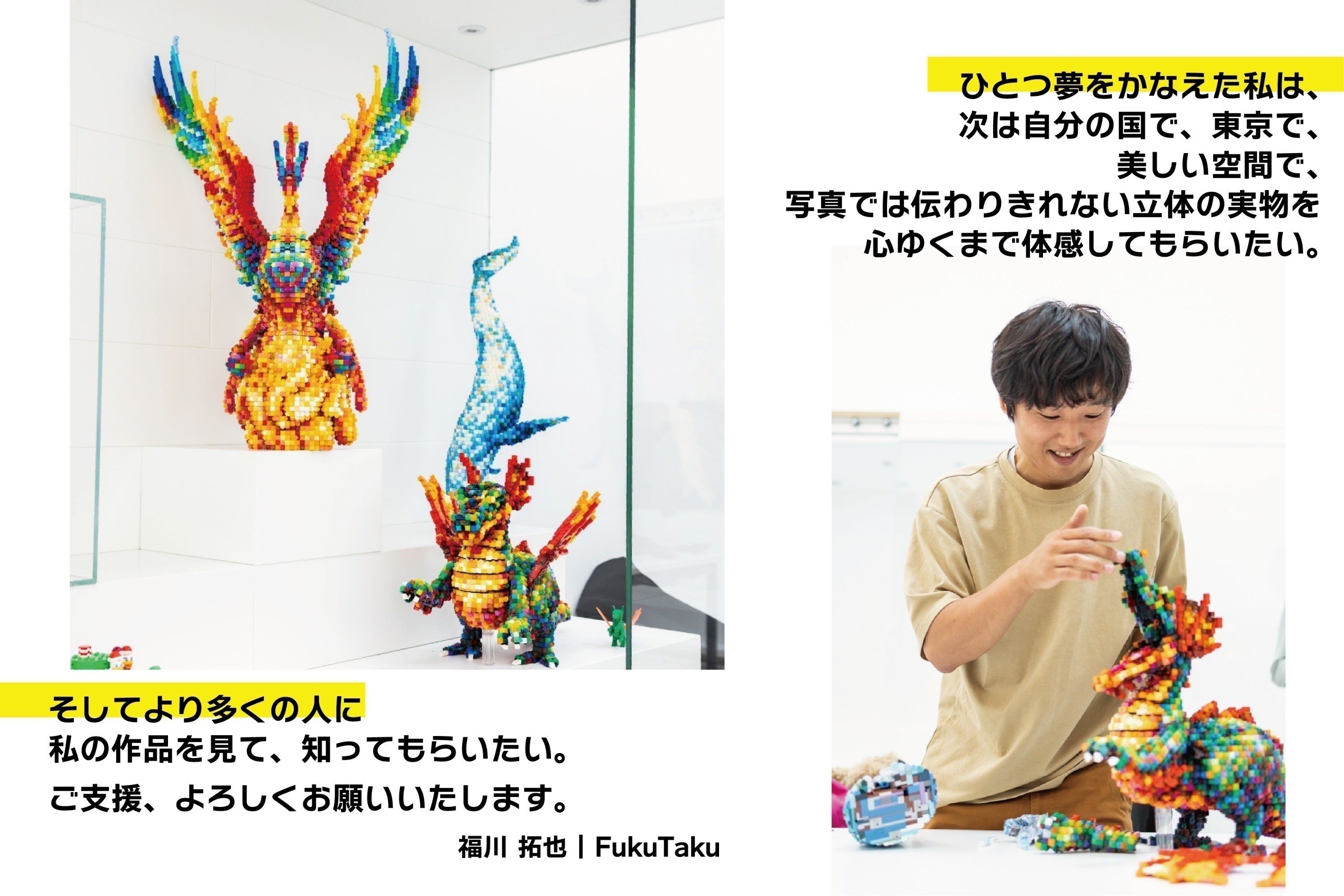 このプロジェクトを通じて多彩なピクセルアートの奥深さやLEGO®︎ブロックによる表現の可能性、そしてデジタルアートが盛んな現代において、実物の立体作品の魅力と価値をより多くの方に知っていただき、私の活動を応援していただきたいです。