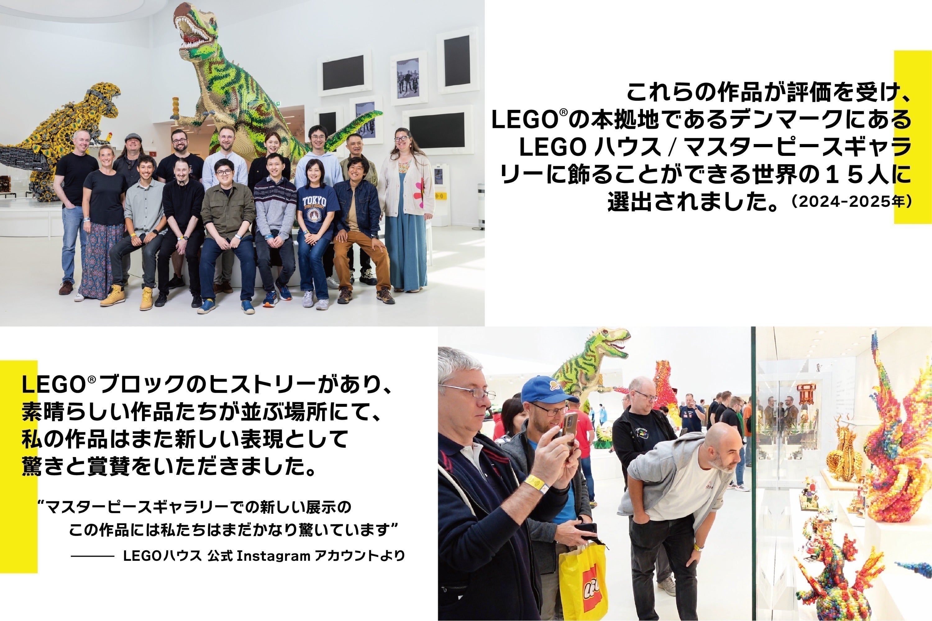 これらの活動が実を結び、私はLEGO社より、年に一度、世界で15人のLEGO®ビルダーに選抜され、2024年9月にデンマークのビルンにあるLEGOハウスの「マスターピースギャラリー」にて代表作3作品を展示・設営いたしました。素晴らしい建築と空間と作品たちの中で、1年間、世界中からのたくさんの来場者に作品を見ていただくことができます。