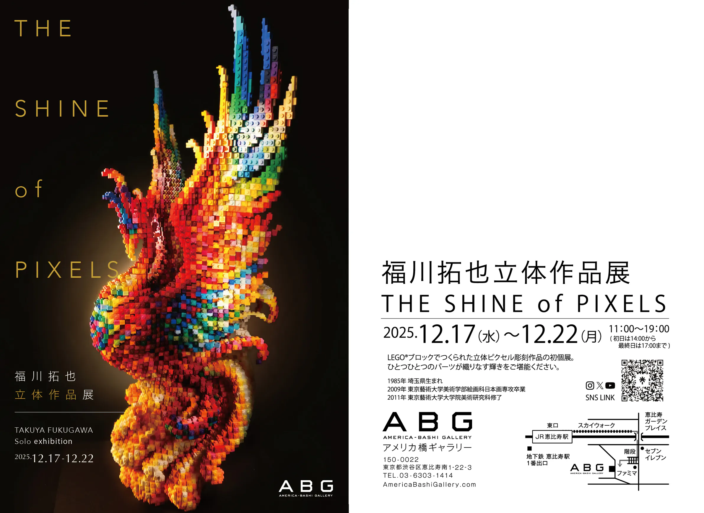 2025/09/09 00:38本プロジェクトの本番、個展のご案内になります。私の在廊日はまだ未定ですが、決まり次第ご報告いたします。ぜひ会場に足を運んでいただければと思います!よろしくお願いいたします。ーーーーーーーーーーーーーーーーーーーーーーーー福川拓也立体作品展THE SHINE of PIXELS2025.12.17(水)~12.22(月)11:00~19:00(初日は14:00から、最終日は17:00まで)アメリカ橋ギャラリー150-0022東京都渋谷区恵比寿南1-22-3TEL. 03-6303-1414AmericaBashiGallery.com制約の中に、アートは生まれる—。本展は、福川拓也による初の立体作品展になります。LEGO®︎ブロックによって組み立てられた火の鳥、鯨、ドラゴン。ピクセル調に造形された作品は、デジタル世界がリアルな空間に具現したかのようなギャップを体感させます。4年前にブロックを手に取り作品を作り始めた作者は、色数・パーツの制約の中での表現に、8 / 16bitのテレビゲームとの親和性を見出し、3Dピクセル彫刻として作品に息を吹き込みます。本展では、代表作「火の鳥」など大作の展示販売の他、小作品のキットの販売をいたします。一つひとつの美しい色の選択と曲線美、“ピクセルの輝き”をご堪能ください。●Profile福川 拓也|TAKUYA FUKUGAWA1985年 埼玉県生まれ。2009年 東京藝術大学美術学部絵画科日本画専攻卒業。2011年 同大学大学院美術研究科修士課程絵画専攻修了。2021年 絵画からブロックによる立体制作に移る。2024年 ビルン/デンマークにあるLEGOハウスのマスタピースギャラリーにて作品展示(2024年〜2025年)ーーーーーーーーーーーーーーーーーーーーーーーー もっと見る