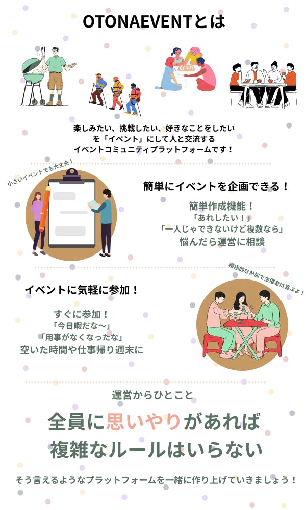 OTONAEVENTは、誰もが気軽にイベントを主催・参加できる、新感覚のプラットフォームです。