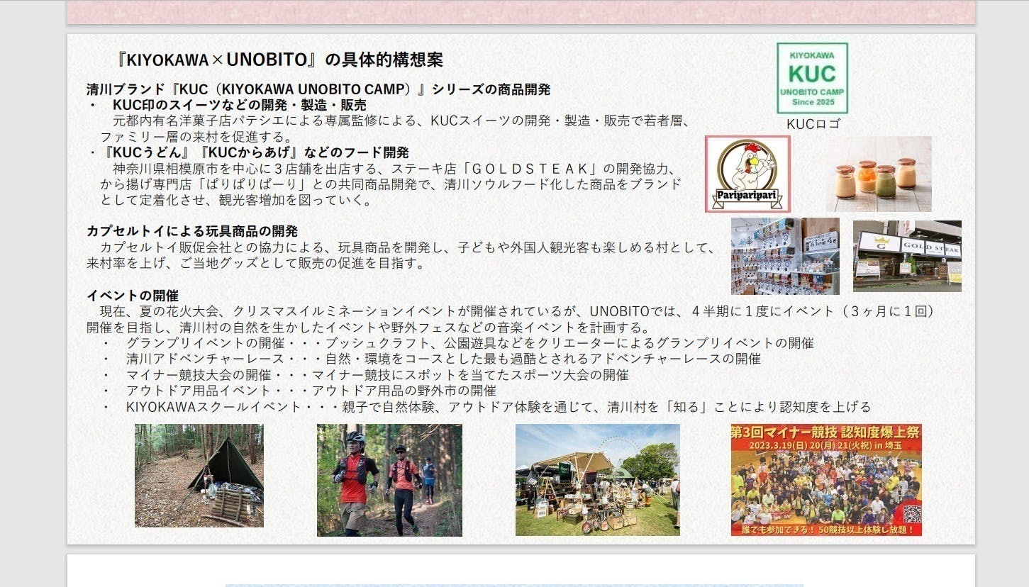 2025/01/12 10:43UNOBITOプロジェクトでは、清川村での地域創生の拠点場所を選定していましたが、関係者との話し合いなどにより、第一号の拠点が決定しました。宮ケ瀬湖畔公園商店街である水の郷商店街の一角で新店舗(カフェ)兼UNOBITOプロジェクトの拠点が決定しました。今後、商品開発や新店舗オープンまでの様子をSNS(インスタグラム・Facebook)で更新していきますので、フォローを宜しくお願いします。清川村では、イベント開催への尽力、観光客の増加、移住者・移転企業を考えている方へのロビー活動なども行っていきます。SNSなどでもご理解していただける仲間が増え、私たちのコンセプトである『楽しい』を広める考えがより多くの方々へ届くように頑張っていますので、よろしくお願いします(^^)/ もっと見る