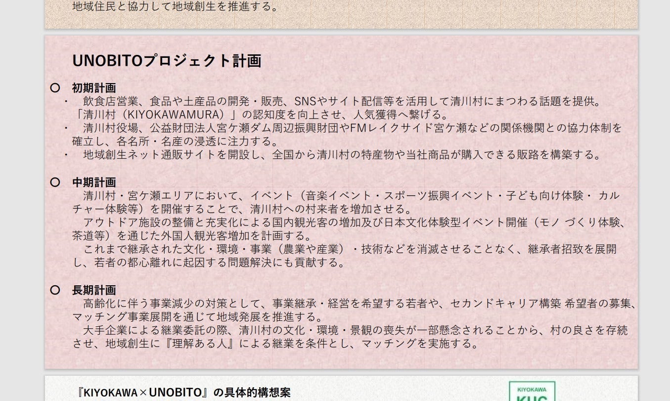 2025/01/12 10:43UNOBITOプロジェクトでは、清川村での地域創生の拠点場所を選定していましたが、関係者との話し合いなどにより、第一号の拠点が決定しました。宮ケ瀬湖畔公園商店街である水の郷商店街の一角で新店舗(カフェ)兼UNOBITOプロジェクトの拠点が決定しました。今後、商品開発や新店舗オープンまでの様子をSNS(インスタグラム・Facebook)で更新していきますので、フォローを宜しくお願いします。清川村では、イベント開催への尽力、観光客の増加、移住者・移転企業を考えている方へのロビー活動なども行っていきます。SNSなどでもご理解していただける仲間が増え、私たちのコンセプトである『楽しい』を広める考えがより多くの方々へ届くように頑張っていますので、よろしくお願いします(^^)/ もっと見る