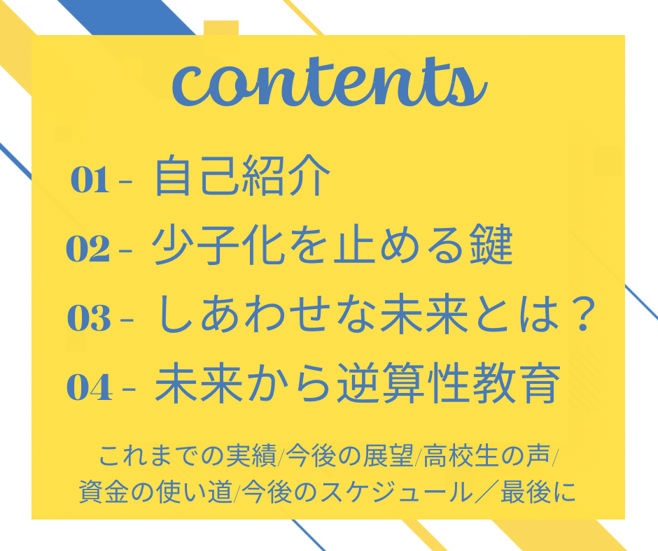 3年半でこの活動が広がり、日本の未来を担う若者の意識が変わっていくことを願い、ぜひ皆様のお力添えをお願い申し上げます。