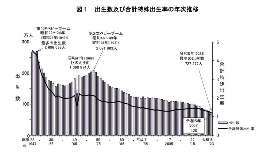 現在の日本の一人の女性が一生のうちに産む子供の平均数を示す「出生率」は1.20(2023)となっており、毎年下降傾向にあります。(図1)