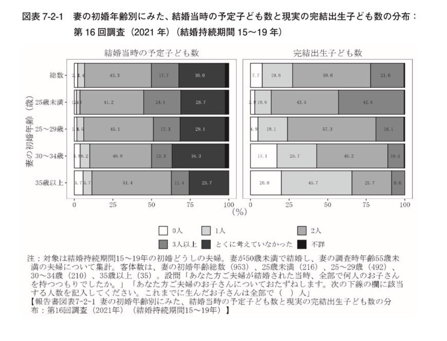 そして、結婚している夫婦は半数以上が子供を望んでおり、理想の子供の数は「2人以上」。結婚する年齢が早いほど、子供の数が多いことが分かっています。(図表7-2-1)