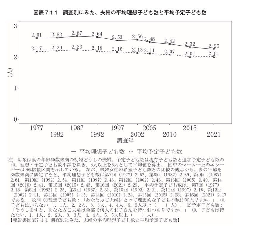 出生率は第二次ベビーブームの1973年から減り続けており、「夫婦の理想子供数と平均予定子供数」は1977年以降少しずつ減ってはいますが、2-3人の間から外れてはいません。ということは、結婚さえすれば、ほとんどの夫婦は2人以上子供を望むと言えます。(図表7-1-1)