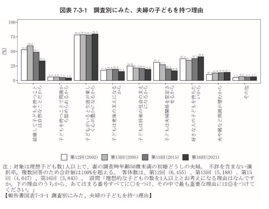 しかし、結婚している夫婦の7割以上は、「子供がいると生活が楽しく心豊かになるから」という理由で子供を持ちたいと願っている人たちが多いことがわかります。(図表7-3-1)