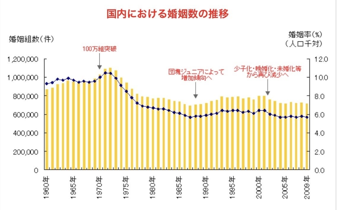 水位しています。5人に1人が結婚しない現在の状況から、『結婚をしたい』という若者を増やすことが本当の少子化対策となるのではないでしょうか?(国内における婚姻数の推移厚生労働省調べ)