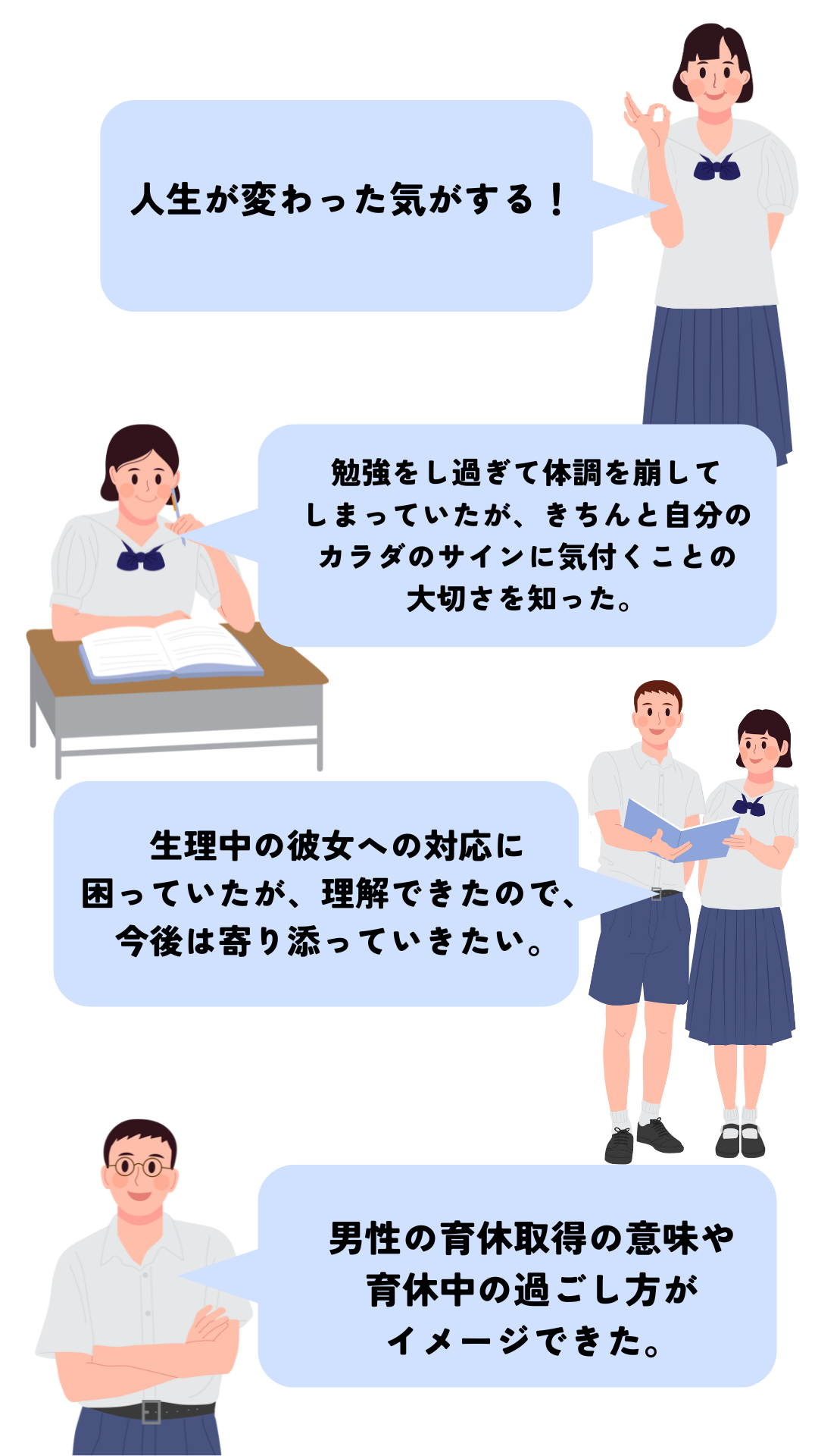 京都橘高校では、卒業生の他にも育休を取得したパパたちからのメッセージを聞き、男子生徒の皆様からは、『パパになるイメージができた』『男性育休について知ることができてよかった』などの声を頂きました。