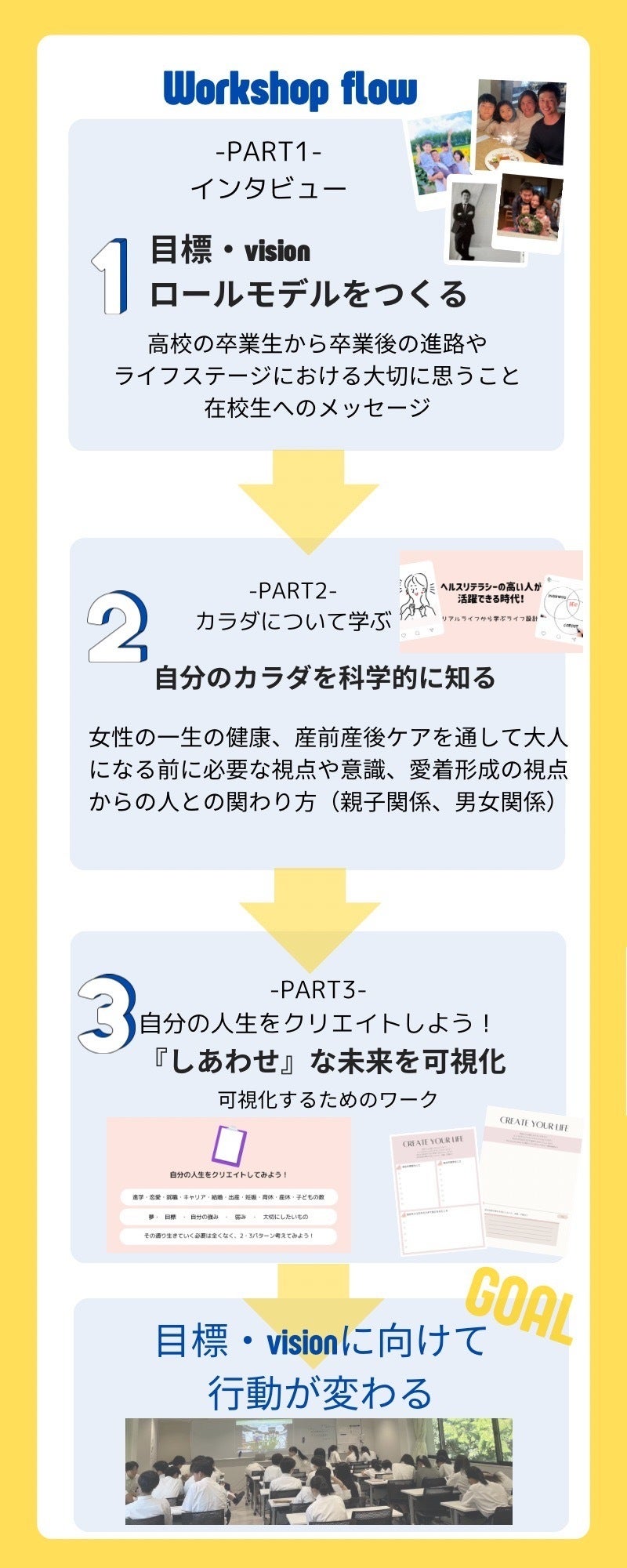 助産師をはじめとする専門家(バースケアラー)から女性のカラダのこと、ウィメンズヘルス(女性の一生の健康について)、産前産後ケアを通してみえてきたママになる前に必要な視点や意識、そして現在ママになった方から若い世代の方へ伝えたいこと。不妊のことなども伝えることで、将来自分が妊娠出産する時期についても考えるきっかけになります。