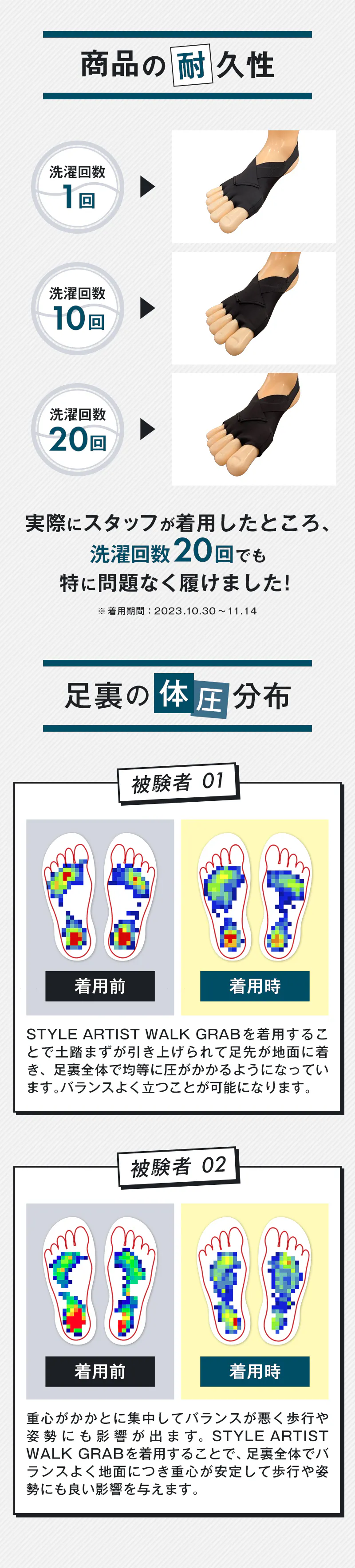 商品の耐久性テストを行い、20回洗濯しても劣化することなく問題なく着用することができました。