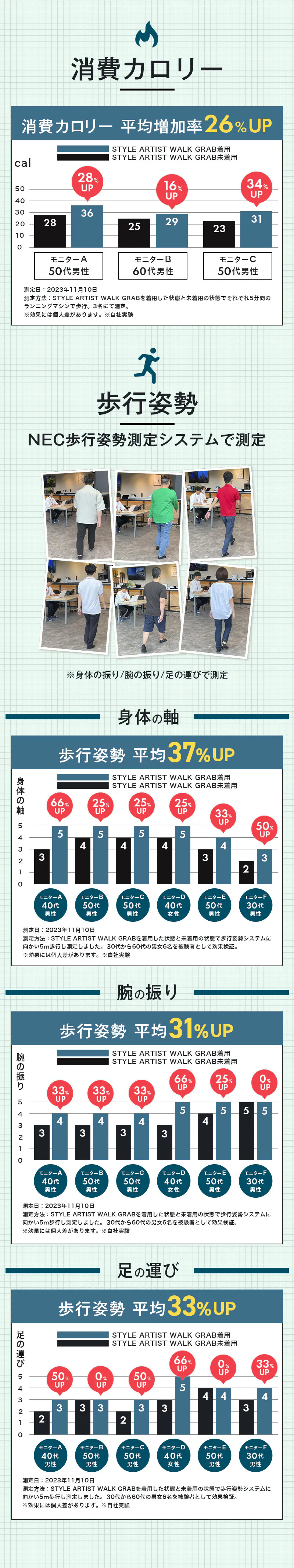 測定方法:STYLE ARTIST WALK GRABを着用した状態と未着用の状態で、歩行姿勢システムに向かい5m歩行。6名にて測定。