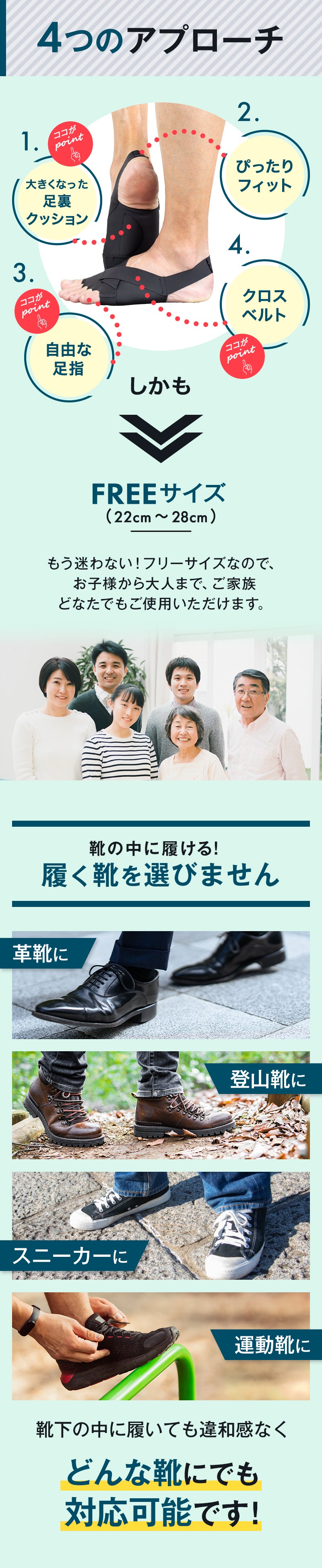 サイズ選びに迷わないフリーサイズ(22cm〜28cm)を採用しているので、どなたでも気軽に着用が可能です。