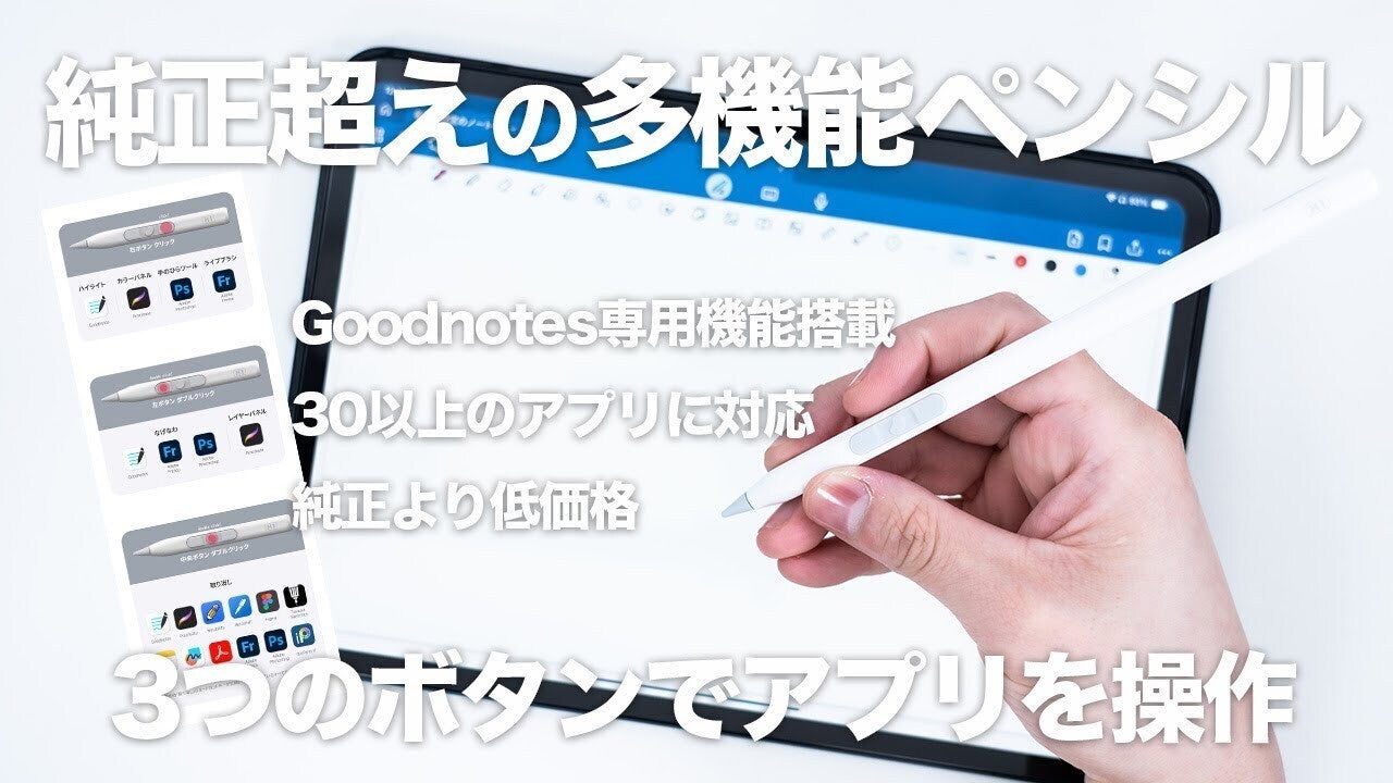 3つのボタンで16種類の機能を簡単に切り替えられるケーブル充電 / ワイヤレス充電の2in1充電方式転がりにくい丸みを帯びた四角形の特許出願デザイン手首の負担が少ない14gの超軽量設計これ一つあれば、ほかのタッチペンは必要ないかも!? iPadユーザーが待ち望んでいたタッチペンです。ぜひチェックしてみてくださいね!