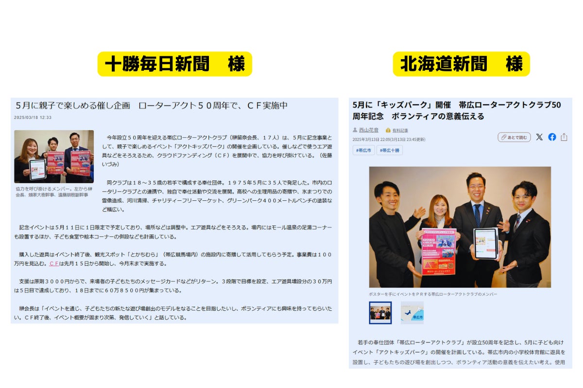 2025/05/05 12:00クラウドファンディングへのご支援、誠にありがとうございました。帯広ローターアクトクラブ クラウドファンディングページ制作担当の遠藤朋樹です。皆様からの温かいご支援のおかげで、目標金額を達成し、「アクトキッズパーク」開催への運びとなりましたこと、心より御礼申し上げます 。 帯広ローターアクトクラブ創立50周年記念事業の一環として企画したこの「アクトキッズパーク」は、天候に左右されずに子どもたちが思いっきり遊べる屋内型の遊び場です 。エア遊具やモール温泉の足湯、ミニゲームなど、親子で楽しめる企画をたくさん用意しています 。 現在はイベント開催に向けて、イベントの打ち合わせやパンフレット作製等を日々行っております!イベントの詳細につきまして、ご案内させていただきます。アクトキッズパーク概要日時:2025年5月11日(日) 10:00~15:00 場所:帯広市立若葉小学校 体育館 対象:未就学児~小学生とそのご家族 参加:入場無料・申込不要・出入り自由 内容: エア遊具、モール温泉足湯、お絵かきコーナー、読み聞かせ(予定)、ミニゲーム(輪投げ、斧投げ、射的、バランスブロックなど)、お菓子景品あり 改めまして、本プロジェクトにご支援、ご協力いただきました全ての皆様に、クラブ会員一同、心より感謝申し上げます。当日、会場でたくさんの笑顔にお会いできることを楽しみにしております。ぜひご家族、ご友人お誘い合わせの上、お気軽にお越しください。【ご協賛いただいた企業・団体の皆様】本プロジェクトの趣旨にご賛同いただき、多大なるご支援・ご協力を賜りました企業・個人の皆様をご紹介させていただきます。皆様の温かいご支援が、子どもたちの笑顔のための大きな力となります。 改めて、心より感謝申し上げます。 もっと見る