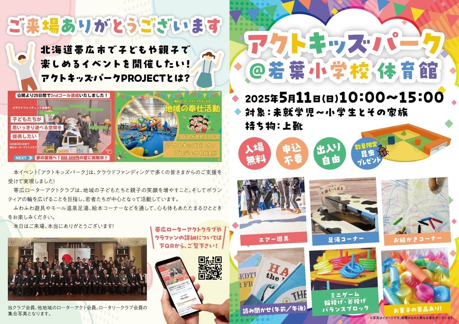 2025/05/05 12:00クラウドファンディングへのご支援、誠にありがとうございました。帯広ローターアクトクラブ クラウドファンディングページ制作担当の遠藤朋樹です。皆様からの温かいご支援のおかげで、目標金額を達成し、「アクトキッズパーク」開催への運びとなりましたこと、心より御礼申し上げます 。 帯広ローターアクトクラブ創立50周年記念事業の一環として企画したこの「アクトキッズパーク」は、天候に左右されずに子どもたちが思いっきり遊べる屋内型の遊び場です 。エア遊具やモール温泉の足湯、ミニゲームなど、親子で楽しめる企画をたくさん用意しています 。 現在はイベント開催に向けて、イベントの打ち合わせやパンフレット作製等を日々行っております!イベントの詳細につきまして、ご案内させていただきます。アクトキッズパーク概要日時:2025年5月11日(日) 10:00~15:00 場所:帯広市立若葉小学校 体育館 対象:未就学児~小学生とそのご家族 参加:入場無料・申込不要・出入り自由 内容: エア遊具、モール温泉足湯、お絵かきコーナー、読み聞かせ(予定)、ミニゲーム(輪投げ、斧投げ、射的、バランスブロックなど)、お菓子景品あり 改めまして、本プロジェクトにご支援、ご協力いただきました全ての皆様に、クラブ会員一同、心より感謝申し上げます。当日、会場でたくさんの笑顔にお会いできることを楽しみにしております。ぜひご家族、ご友人お誘い合わせの上、お気軽にお越しください。【ご協賛いただいた企業・団体の皆様】本プロジェクトの趣旨にご賛同いただき、多大なるご支援・ご協力を賜りました企業・個人の皆様をご紹介させていただきます。皆様の温かいご支援が、子どもたちの笑顔のための大きな力となります。 改めて、心より感謝申し上げます。 もっと見る
