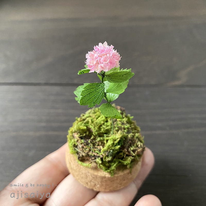 そんな事を考えていたある時、ミニチュア盆栽作家の中村京介さんに「ミニチュアあじさい」の製作方法を教えていただく機会がありました。