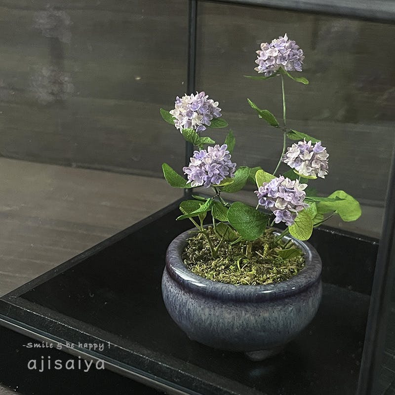 すべて自然素材でつくられたミニチュアあじさいで作った花手水。