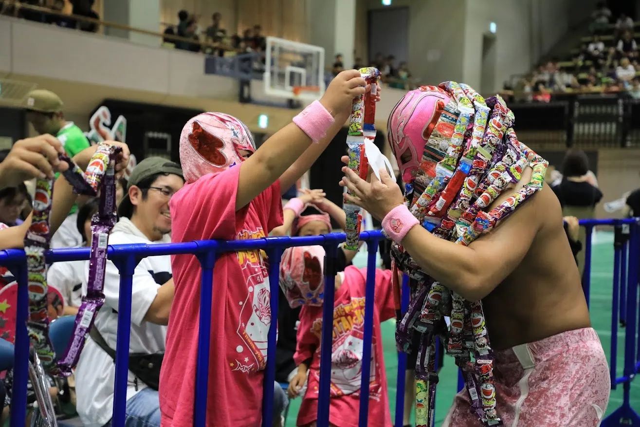 そんな僕にいつのころからか、テーマ曲にのって入場ゲートからリングへ向かう途中に7本~10本をセロハンテープなどで繋げてレイ状にした『うまい棒』を僕の首にかけてくれるファンが現れました。