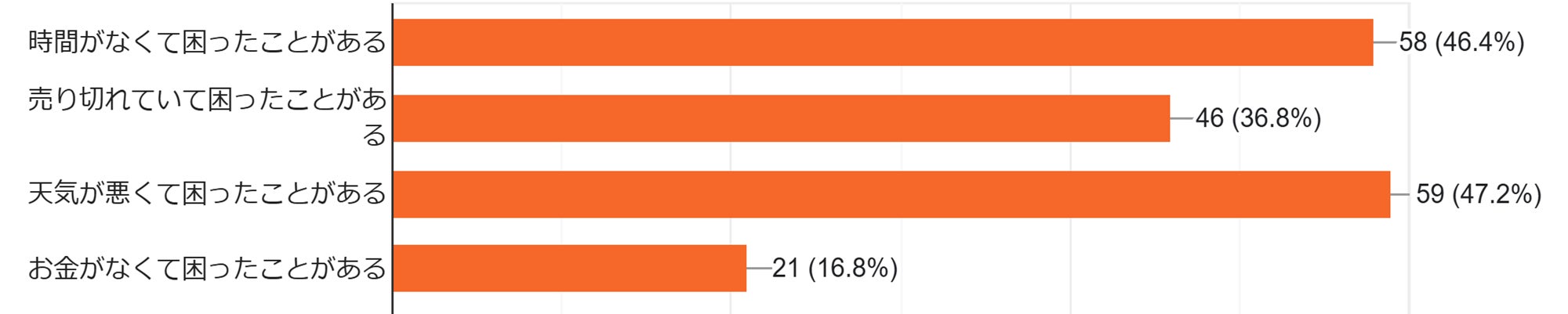 その理由は、上のグラフのとおり、多忙や天候がよくなかったことが原因として挙げられます。