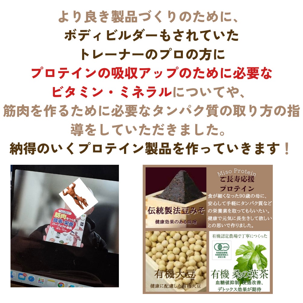 健康のことを考えて、原料は有機大豆と人工甘味料や味付けなどの化学調味料などは全て無添加にしています。ご長寿応援プロテインですが、世の中、無添加のプロテインは多くはありませんので、ダイエットの補助食品としてもおすすめです。