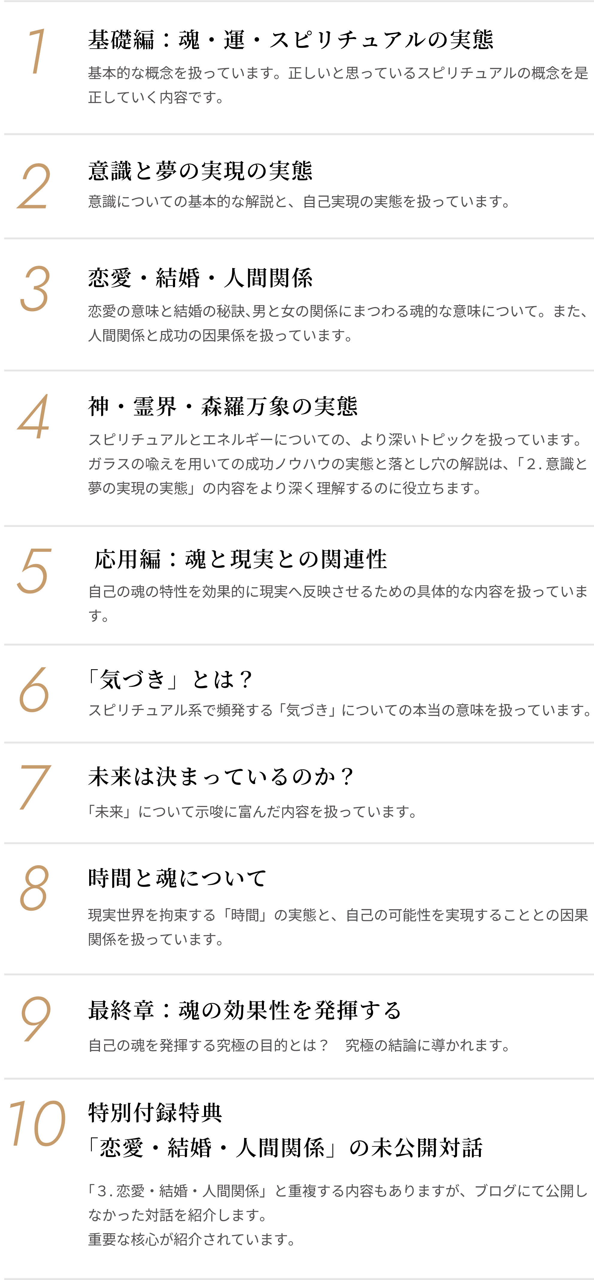 「魂の掟:原本」では240にも及ぶトピックが扱われましたが、亡き祖父:天国おじいの教えの中には難解な教えも多々ありました。そこで、240のトピックを個別に解説した解説動画を特別会員コミュニティにて約5年間にわたって毎週1本提供してきました。これは単なる解説にはとどまりません。その時々での新たな対話における情報を盛り込んだ「続:魂の掟」ともなっており、最後には理想実現にてき面な究極の奥義が明かされています。
