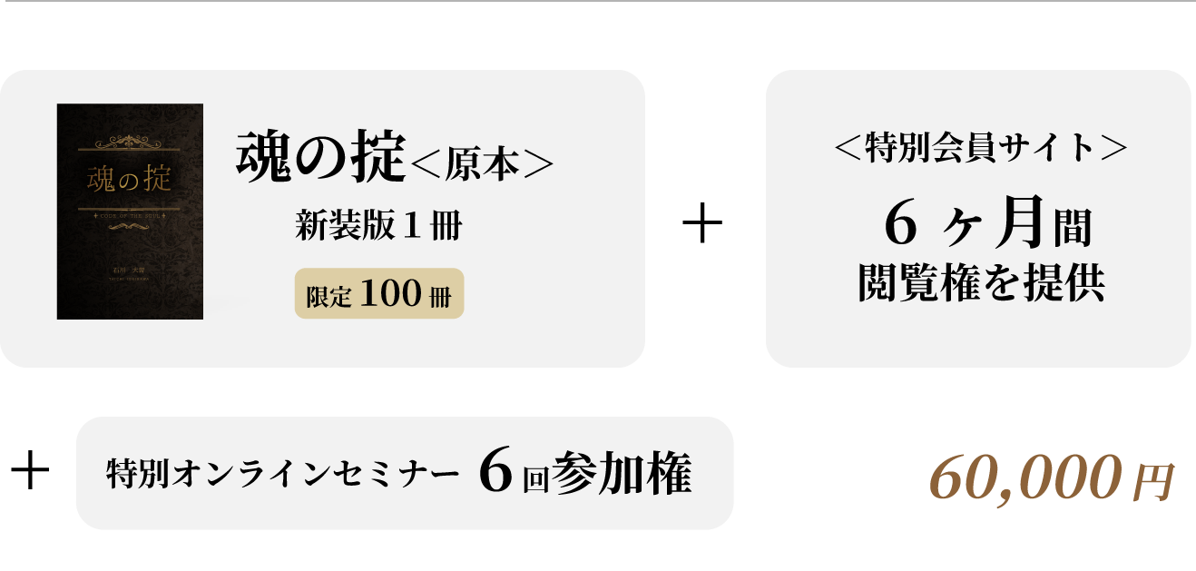 >>“魂の掟:原本”新装版1冊 + 特別会員サイト3ヶ月間の閲覧権を提供 + 特別オンラインセミナー3回参加権を支援する